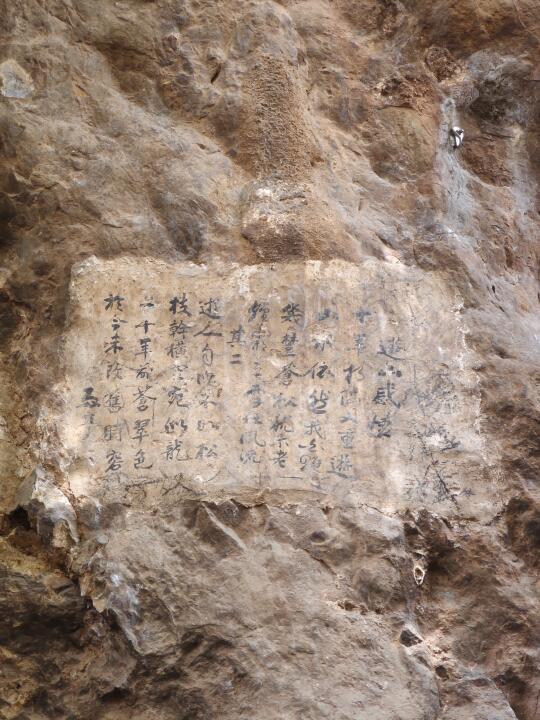 [打卡R]原路出寺走大青树那边上山,路边崖壁曾有非法攀岩活动,已被禁止,但留下不少销钉,壁面有民国题诗(图10)。半山一小殿内有两处摩崖题刻,一为嘉靖二十二年《圆通碑记》,一为《观音阁小引》(图12),从碑文“经今百十余年至嘉靖十四年”推算,至迟在明永乐年间此处已有寺院。