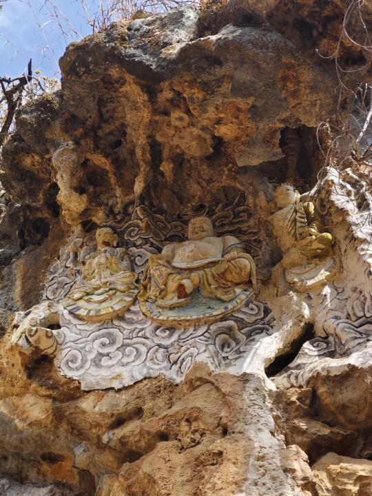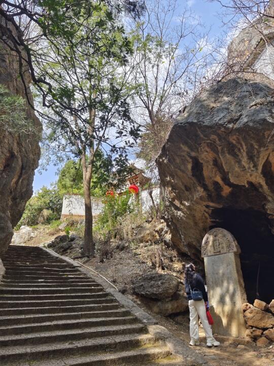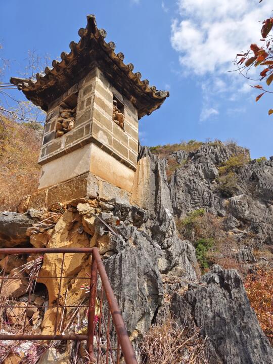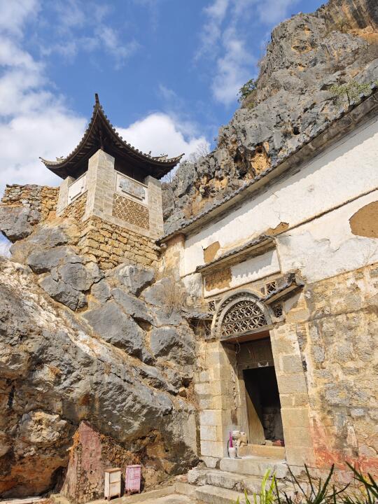 大营观音阁位于云南大理州宾川县大营镇水长村,万历《云南通志》记载此处为“观音箐寺”,称其“岩谷奇绝”,有观音洞“崆峒嵢岈,奇诡不可名状,中有天然石观音像”,山上现存题刻也称“有灵秀一石,不雕琢而自现观音”。