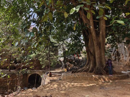 [打卡R]今山前有一孔窍玲珑的巨石形成小峰,内有一洞,名“蛇洞”,不知形似观音的天然岩石是否在此(图3)。绕过石峰,溪涧上一座石桥名“普渡桥”,此溪“春冬水落,夏潦陡涨”,现在正是完全干涸,或许夏天会更漂亮吧。过桥左边是民国二十一年《普渡桥功德碑记》,路通往山脚寺院,右边是一棵大青树,通往山上(图4、5)。