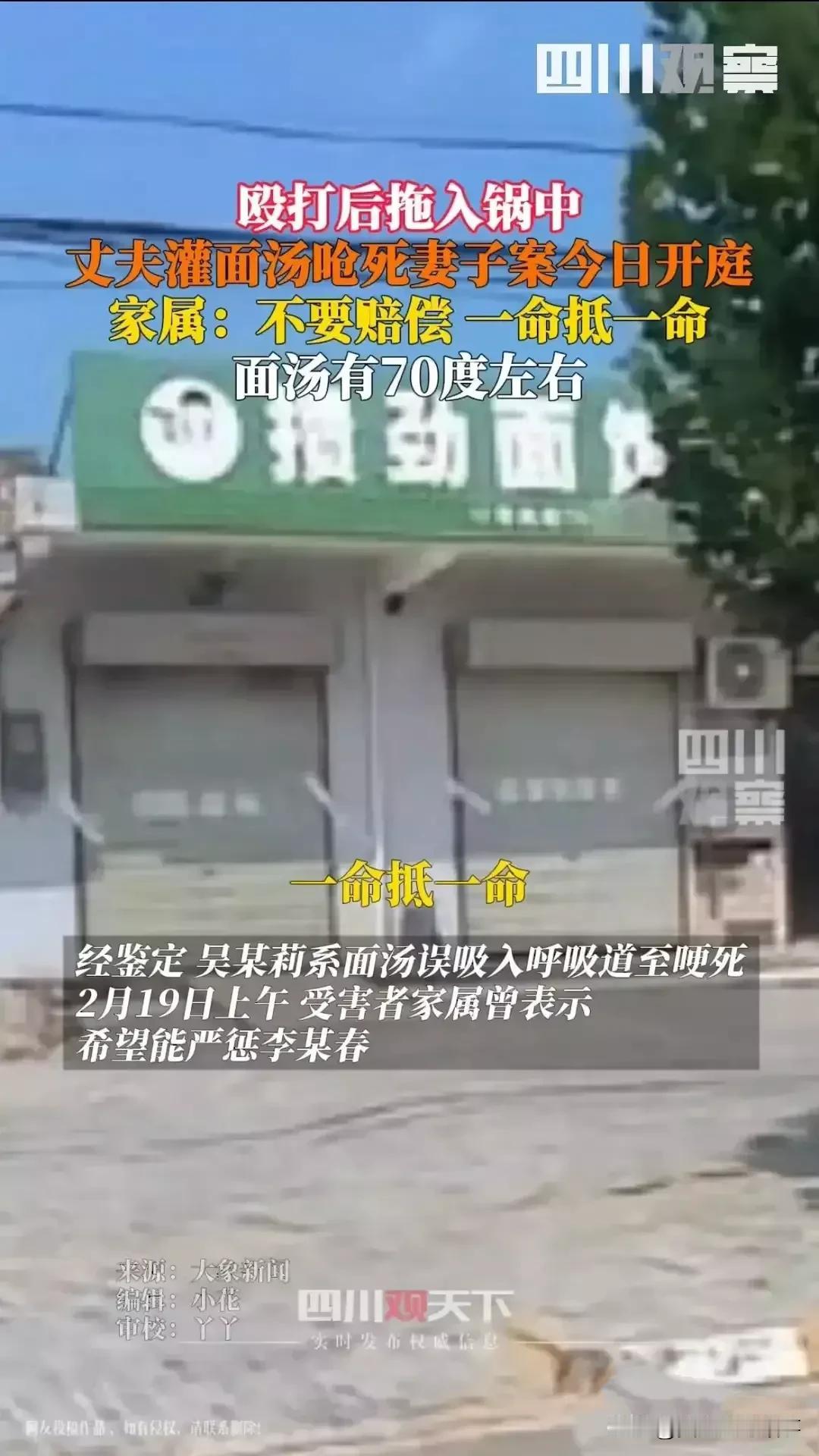39岁吴某莉被丈夫灌面汤呛死,他儿女却要求姥姥原谅李某春,姥姥左右为难。 39岁女人吴某莉,太老实了,曾两次向李某春提出离婚,不敢说出原因,被母亲劝和,多年后,她被李某春灌面汤呛死。 2024月9月4,陕西渭南白水县,凌晨,杜康镇大杨街道,一家攒劲面馆内灯光通明。 李某春坐在一张餐桌上,一边饮酒,一边数落吴某莉太笨,什么都做不好。 吴某莉面露愠色,却害怕被李某春家暴,她瞪了李某春一眼,就转身走进卧室睡觉。 半晌,李某春醉意蹒跚走进卧室,因感情问情,和吴某莉发生吵架。 吴某莉被吵闹声惊醒,她满眼委屈,泪水扑簌簌地流下。 一会儿,她转身走出卧室,来到餐厅大厅,趴在一张餐桌上低声哭泣。 忽然,李某春从卧室走出,来到餐厅大厅,他用钢尺,皮带,菜刀等工具殴打吴某莉。 一瞬间,吴某莉遍体鳞伤,她想给母亲打电话求救,被李某春夺过手机。 吴某莉惊惶无措,坐在地上瑟瑟发抖,不停地向李某春求饶。 过了一会儿,李某春把吴某莉拉到厨房,将70度面汤,灌进吴某莉口中。 吴某莉已经遍体鳞伤,喉咙被面汤烫伤,她不禁发出一阵惨叫声。 顷刻,李某春把吴某莉拖入,冒着热气的面汤锅里,吴某莉无力反抗,她被面汤呛死。 案发后,李某春被警方抓捕,依法对他刑事拘留,检察院以故意杀人罪,对李某春提起诉讼。 今年春节,李某春的女儿和儿子,来到姥姥家里。她(他)们要求姥姥,原谅李某春,我们已经没有妈妈,不能再没有爸爸。 姥姥双眉紧蹙,低头深思,我原谅李某春,就对不起,被李某春家暴致死的吴某莉。 一会儿,姥姥拒绝了外孙女,外孙的要求,不谅解李某春,让李某春一命抵一命。