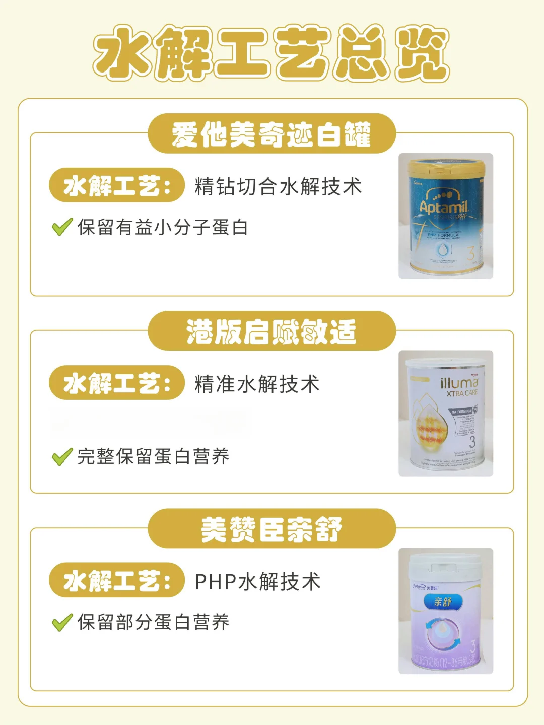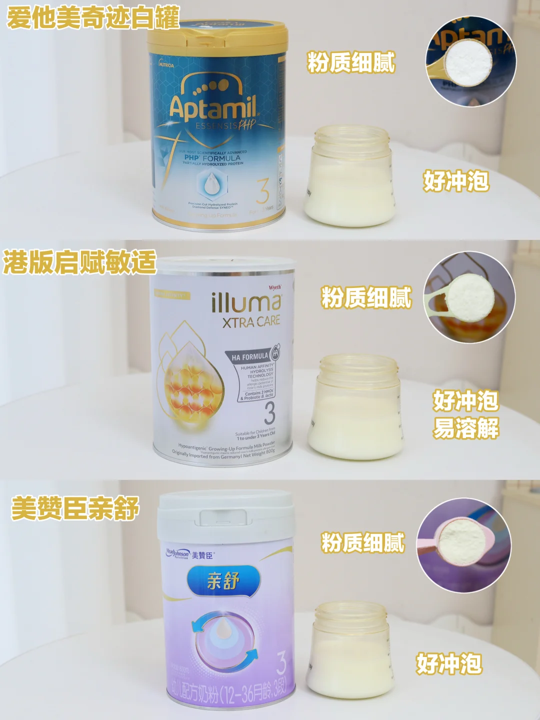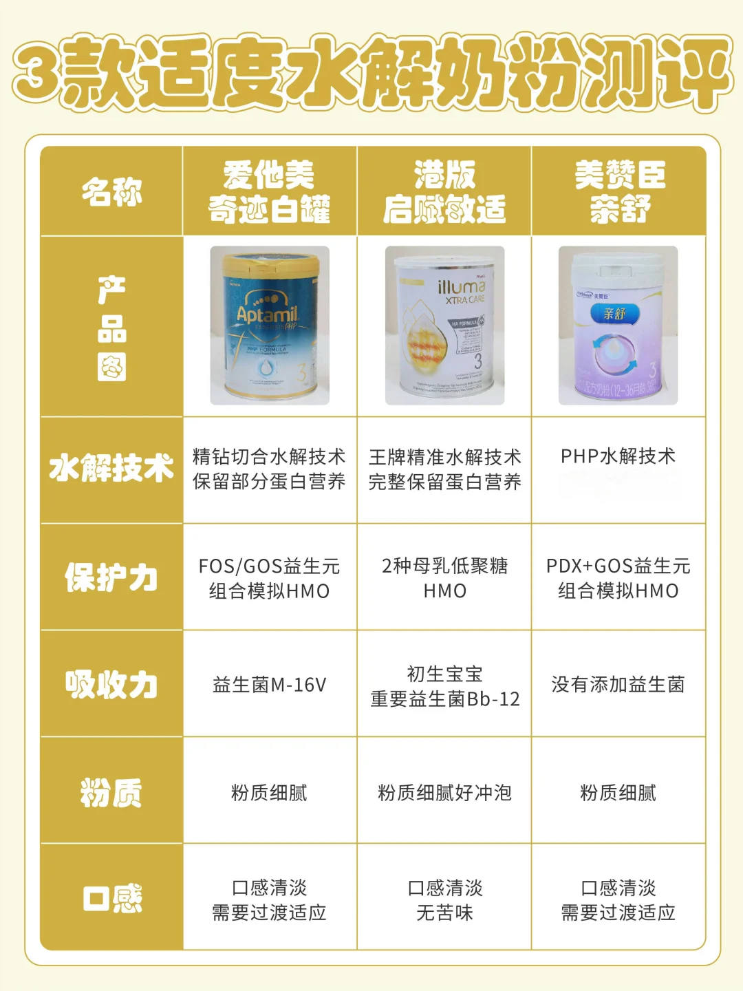 我找到市面上三款比较热门的适度水解奶粉,分别是爱他美奇迹白罐、港版启赋敏适和美赞臣亲舒