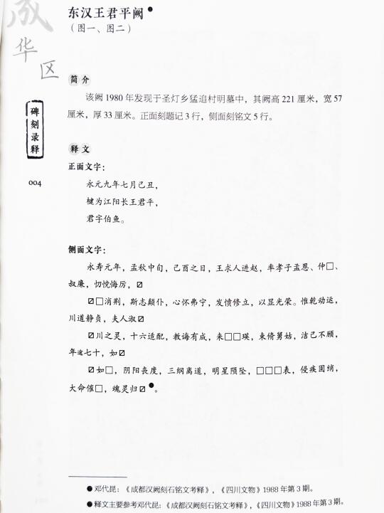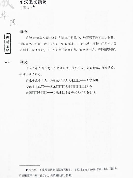 1980年成都发掘的一座明墓中,发现两块抵门石上刻有铭文,经释读发现这是两件汉阙。一件是王君平阙,王君平生前是犍为郡江阳长,江阳就是现在的泸州,所以泸州博物馆展出了此阙的复制品。另一件王文康阙,王文康似乎是个经学家,很多门生为他送行。 图1出自泸州市博物馆网上展厅,余图出自《成华区碑刻录释》。
