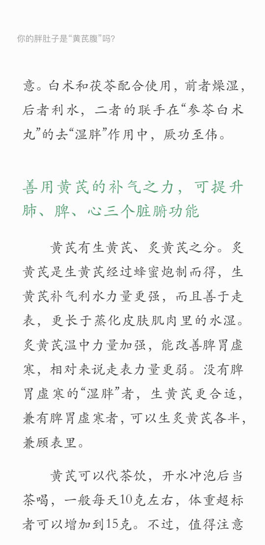 黄芪可以代茶饮,开水冲泡后当茶喝,一般每天10克左右,体重超标的是,黄芪偏热,容易引起或者加重便秘。喝黄芪茶时,要多吃纤维素含量高的食物,比如红薯、猕猴桃、火龙果、芹菜等。只有保持大便通畅,黄芪才能持续使用。