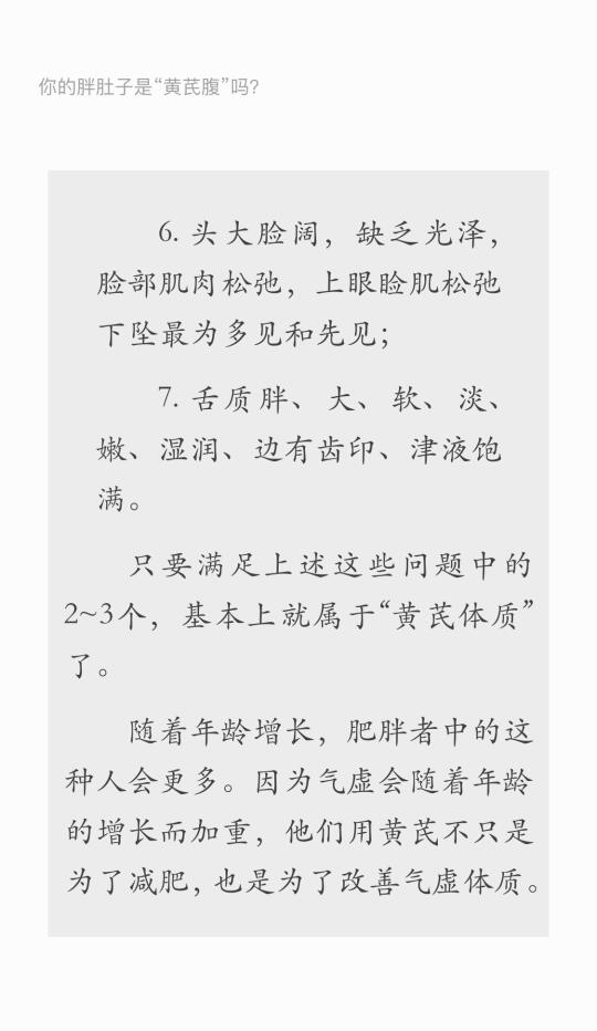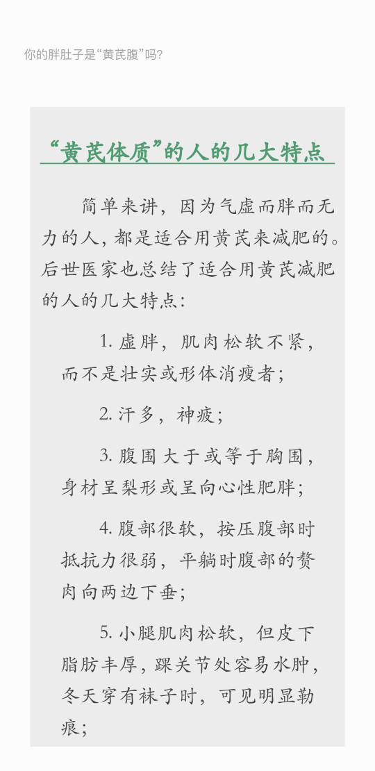 [向右R]如果是典型的“湿胖”,那么不仅体重高,舌头也会有齿痕。因为含水量高而舌面是水滑的,身体也是胖肿的,尤其到下午,腿脚会发沉,此时不妨用这个“大豆方”作为日常食疗。做法很简单,就是做鲤鱼汤、鲫鱼汤时加黑豆20~30克,白术15~20克。
