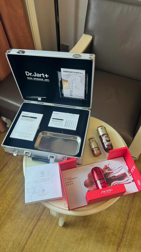 在剧组收到礼物 很开心! 1.CLARINS 双萃精华 2.HERBMODA 修护面膜 3.资生堂 精华 4.Dr.Jart+ 面膜 美容护理系列