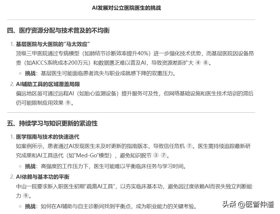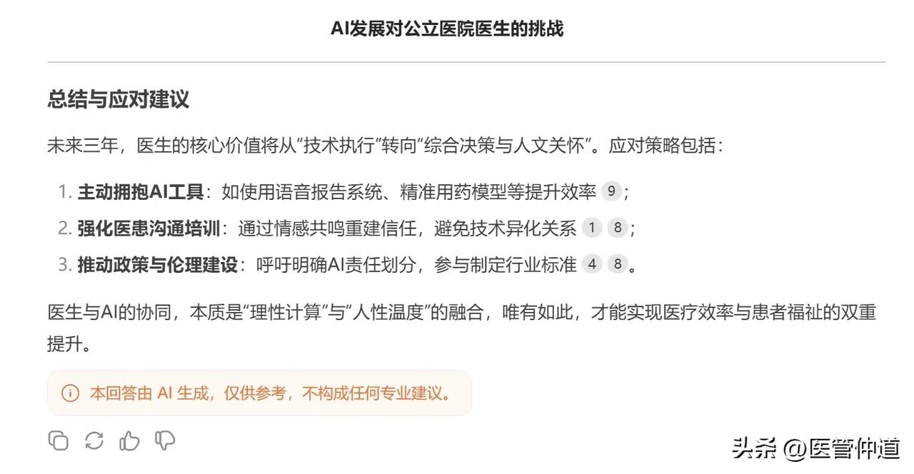 AI技术快速迭代,对于医生来说将面临什么? DeepSeek的建议,请看本微头条相关图片,但我更想强调的是AI对医患关系的重新构建,正如DeepSeek如下所说: 患者通过AI工具自行解析检查报告后,可能质疑医生诊断。例如,某患者因AI提示“胰腺癌风险”而质疑医生的肠胃炎诊断,尽管最终排除癌症,但信任已受损。类似案例可能导致医生被迫采取防御性医疗,增加不必要的检查或保守治疗。 在AI的加持下,医生可能更倾向于多检查,同时也会被倒逼强化业务技能学习。但患者端对医生的信任度有可能会进一步下降,而代价是患者的就医成本会提升。 万事万物基本逃不出双刃剑的自然法则,AI对于医患的影响,也是如此。ai
