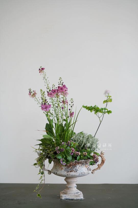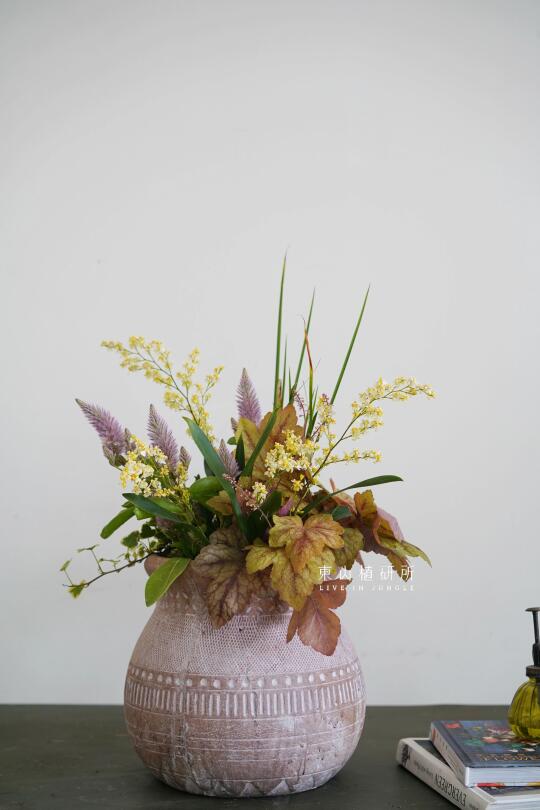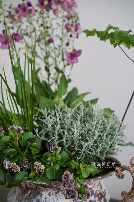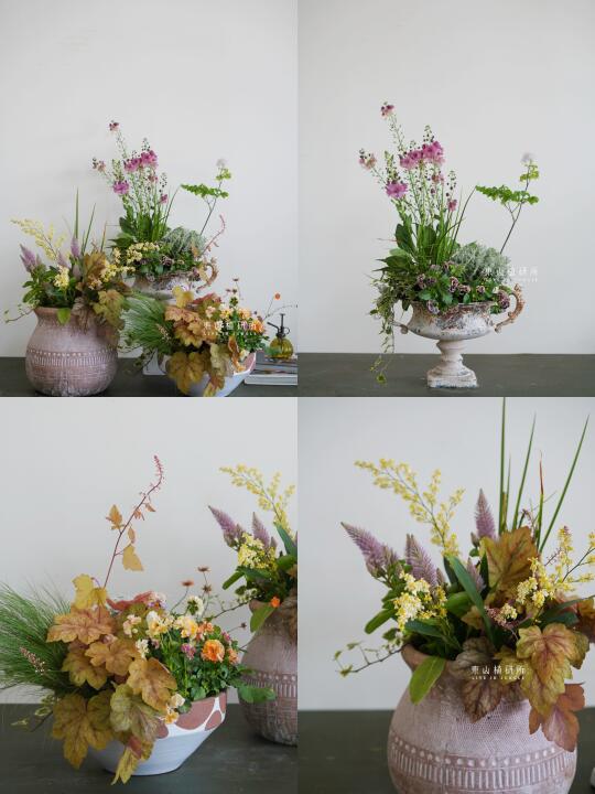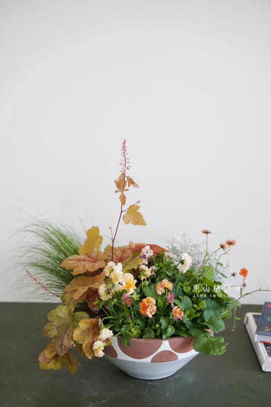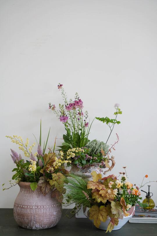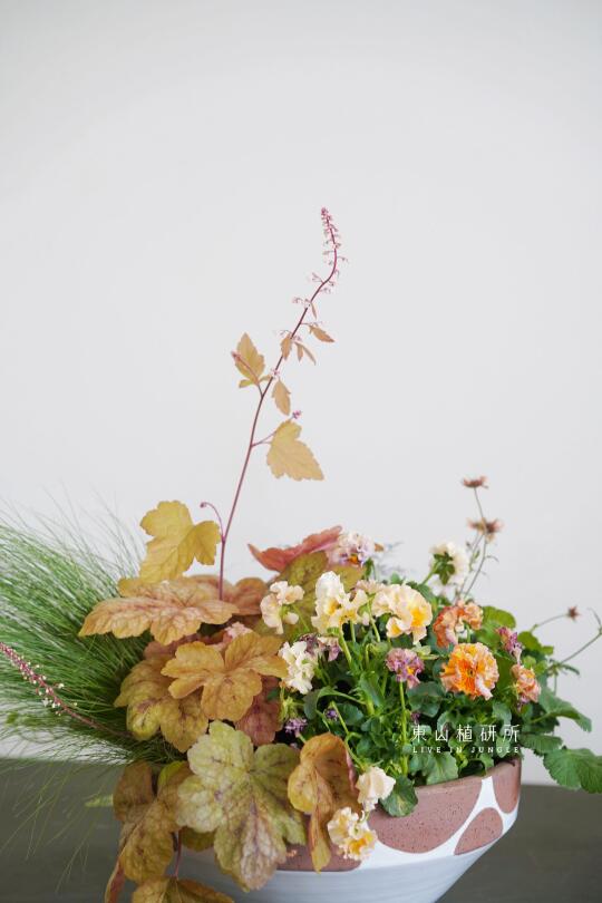 野趣草花组盆设计 橙黄或粉色等亮色调 充满春日的活泼气息 花叶植物在组盆中也可以很出彩 用植物组盆打造可桌上观赏的春日花园 ——————
