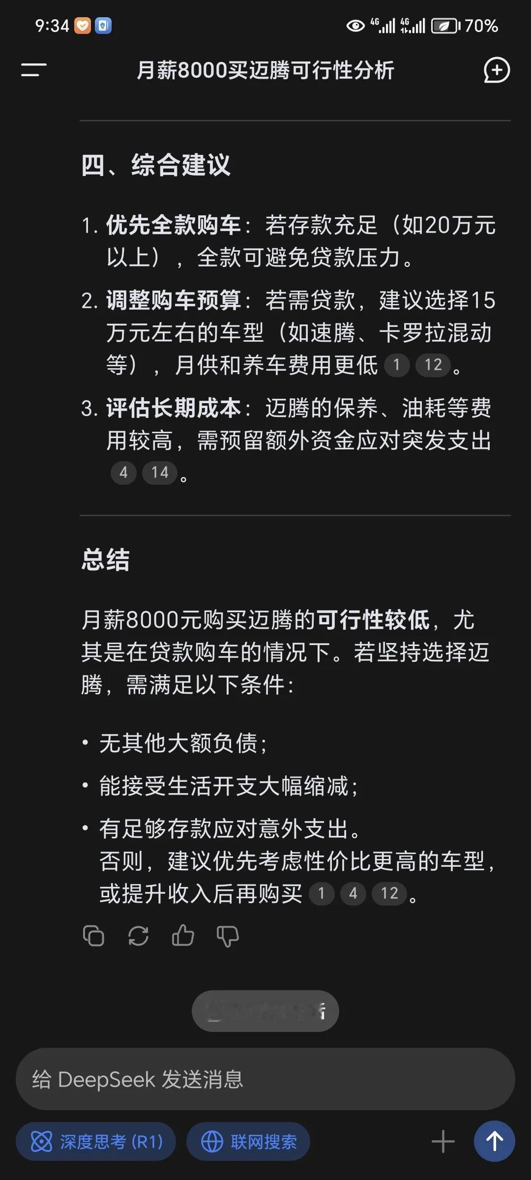 月薪8000买得起迈腾吗?问deepseek的回答这么牛,确实贷款也得干迈腾迈