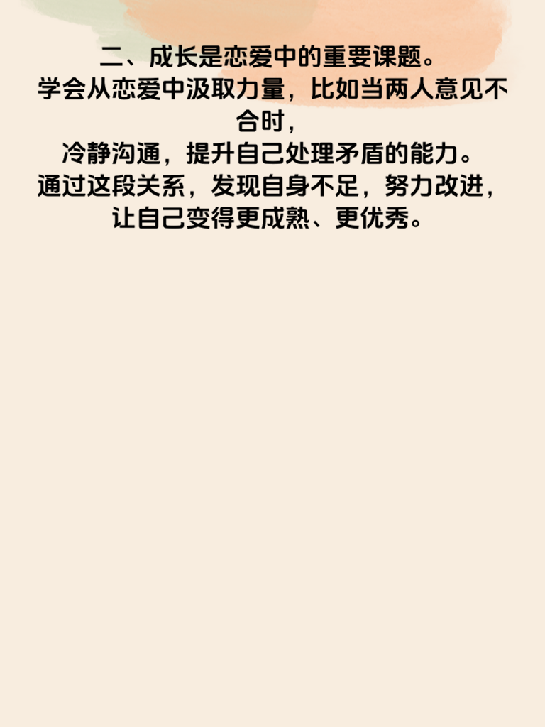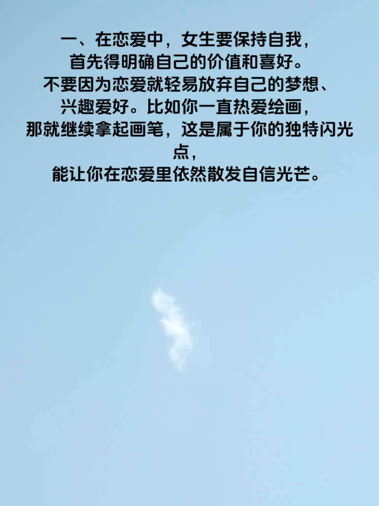 一、在恋爱中,女生要保持自我,首先得明确自己的价值和喜好。不要因为恋爱就轻易放弃自己的梦想、兴趣爱好。比如你一直热爱绘画,那就继续拿起画笔,这是属于你的独特闪光点,能让你在恋爱里依然散发自信光芒。 二、成长是恋爱中的重要课题。学会从恋爱中汲取力量,比如当两人意见不合时,冷静沟通,提升自己处理矛盾的能力。通过这段关系,发现自身不足,努力改进,让自己变得更成熟、更优秀。 三、保持自我并不意味着封闭自己,而是在爱对方的同时,也别忘了爱自己。给自己留出独处的时间,去思考、去沉淀。在这段时间里,专注于自我提升,比如阅读书籍丰富内涵,坚持运动塑造好身材。 四、要清楚自己在恋爱中的底线和原则,不轻易为了迎合对方而突破。只有坚守自我,才能赢得对方真正的尊重和爱。同时,在恋爱中不断成长,成为更好的自己,你们的爱情也会更加稳固和美好。