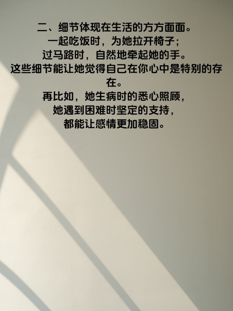 一、恋爱中,细节真的至关重要。一个不经意的眼神,一句贴心的问候,都可能成为感情升温的催化剂。比如,记住她喜欢的口味,在她疲惫时递上一杯温暖的饮品,这些看似微小的举动,却能让她感受到你的用心。 二、细节体现在生活的方方面面。一起吃饭时,为她拉开椅子;过马路时,自然地牵起她的手。这些细节能让她觉得自己在你心中是特别的存在。再比如,她生病时的悉心照顾,她遇到困难时坚定的支持,都能让感情更加稳固。 三、然而,细节也不仅仅是这些外在的行为。还有倾听她的心事,给予她充分的尊重和理解。不打断她说话,用专注的眼神回应她,让她知道你在乎她的感受。在细节中展现你的爱意,才能让这段恋爱走得更长远,收获满满的幸福。