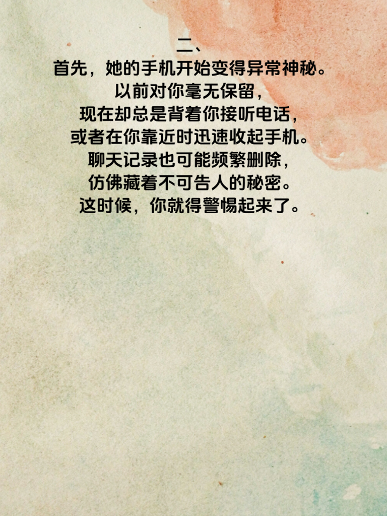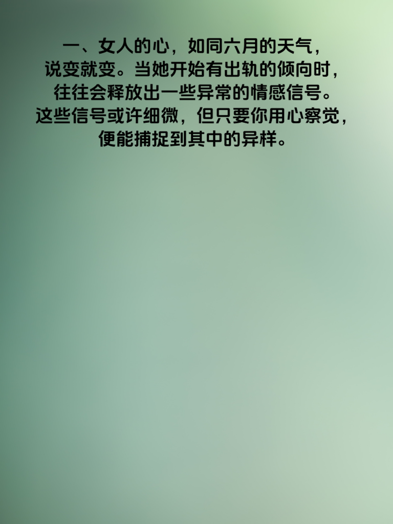 一、女人的心,如同六月的天气,说变就变。当她开始有出轨的倾向时,往往会释放出一些异常的情感信号。这些信号或许细微,但只要你用心察觉,便能捕捉到其中的异样。 二、首先,她的手机开始变得异常神秘。以前对你毫无保留,现在却总是背着你接听电话,或者在你靠近时迅速收起手机。聊天记录也可能频繁删除,仿佛藏着不可告人的秘密。这时候,你就得警惕起来了。 三、再者,她对你的态度也会发生改变。曾经的温柔体贴消失不见,取而代之的是不耐烦和冷漠。她不再关心你的工作和生活,甚至对你的喜怒哀乐都无动于衷。这种明显的态度转变,很可能是她心有所属的表现。 四、另外,她开始注重自己的外表,频繁化妆、买新衣服,似乎想要在别人面前展现出更好的自己。而且,她会找各种借口外出,行踪变得飘忽不定。这一切都在暗示着,她的生活中可能出现了新的人。 五、男人啊,当你发现这些异常情感信号时,不要惊慌,也不要盲目指责。冷静下来,好好沟通,弄清楚她内心的真实想法。也许,一切还有挽回的余地。但如果真的无法挽回,也要勇敢面对,毕竟感情的事,强求不来。