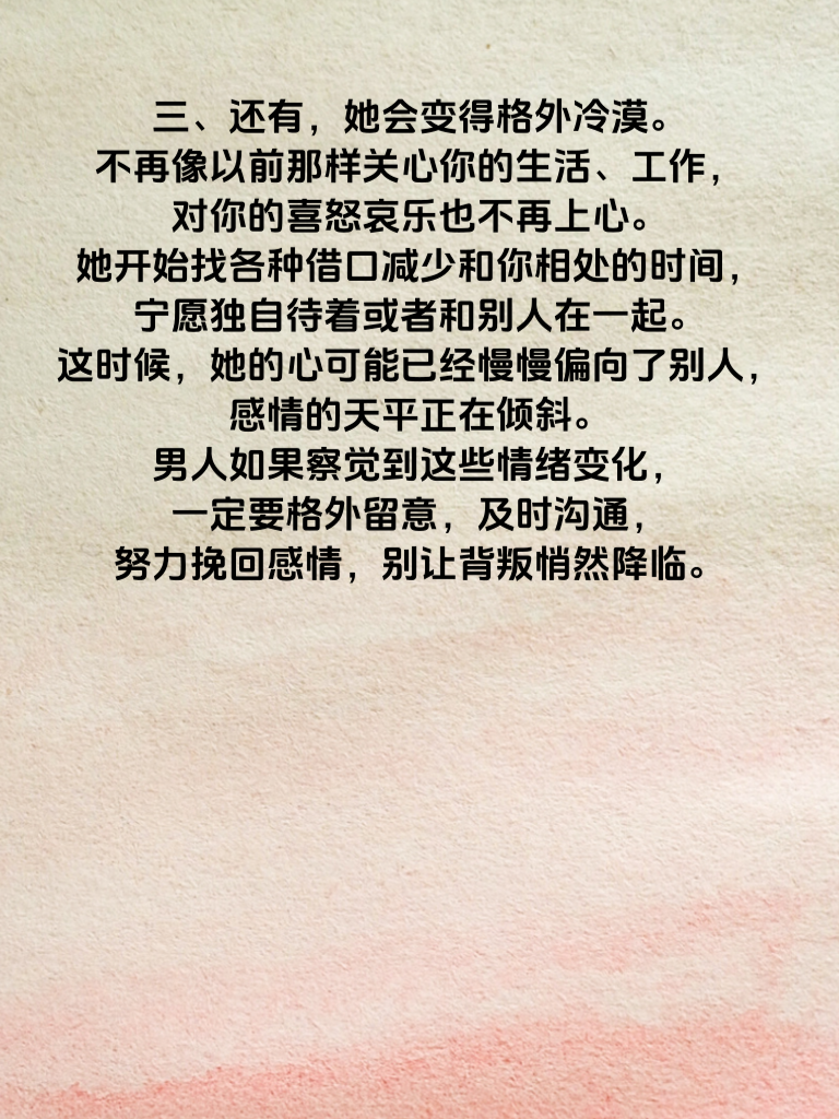 一、女人出轨前,情绪往往会变得异常敏感。曾经那些微不足道的小事,如今却能轻易触动她的心弦。可能你只是无意间说了句重话,她就会陷入深深的失落与委屈中,甚至无端地发脾气。这是因为她的内心开始有了别的牵挂,对现有的感情产生了动摇。 二、情绪波动大也是出轨前的一个明显变化。一会儿兴高采烈,一会儿又莫名地陷入悲伤。她可能会因为一点小事就开怀大笑,又会因为某个回忆突然变得沉默寡言。这种情绪的大起大落,背后或许隐藏着她对新感情的期待与对旧感情的纠结。 三、还有,她会变得格外冷漠。不再像以前那样关心你的生活、工作,对你的喜怒哀乐也不再上心。她开始找各种借口减少和你相处的时间,宁愿独自待着或者和别人在一起。这时候,她的心可能已经慢慢偏向了别人,感情的天平正在倾斜。男人如果察觉到这些情绪变化,一定要格外留意,及时沟通,努力挽回感情,别让背叛悄然降临。