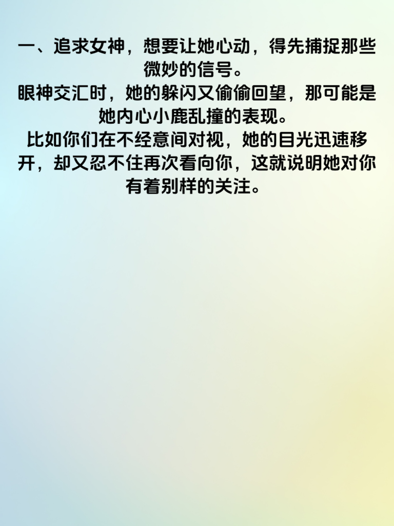 一、追求女神,想要让她心动,得先捕捉那些微妙的信号。眼神交汇时她的躲闪又偷偷回望,那可能是她内心小鹿乱撞的表现。比如你们在不经意间对视,她的目光迅速移开,却又忍不住再次看向你,这就说明她对你有着别样的关注。 二、她会主动找你聊天,而且话题丰富多样。从生活琐事到兴趣爱好,她都乐意与你分享。也许她会跟你吐槽工作中的小烦恼,或者兴奋地讲起周末看的一场精彩电影,这意味着她渴望与你有更深入的交流,对你有了好感。 三、当你出现在她身边时,她会不自觉地整理自己的仪容,比如捋捋头发、整整衣服。这显示出她希望在你面前展现出最好的一面,在意你的看法。 四、她对你的朋友也表现出友善和好奇。会主动和他们打招呼,询问关于你的事情。这表明她不仅对你有兴趣,还想要融入你的生活圈子,进一步了解你。把握好这些信号,就能在追求女神的路上更顺利地让她心动。