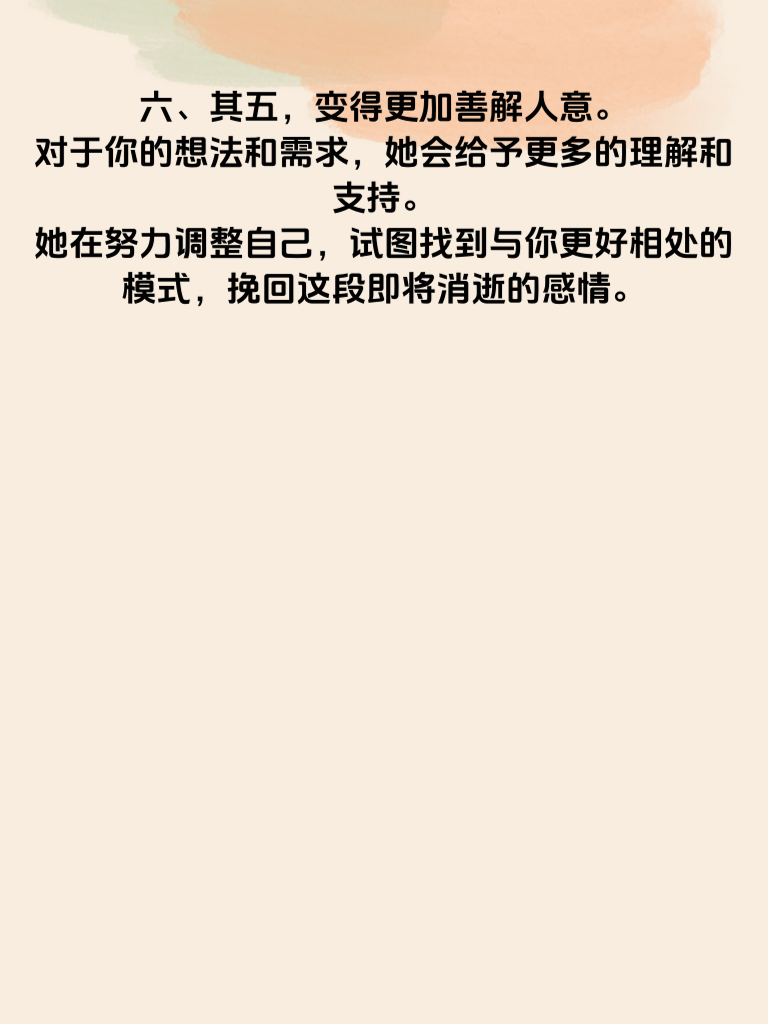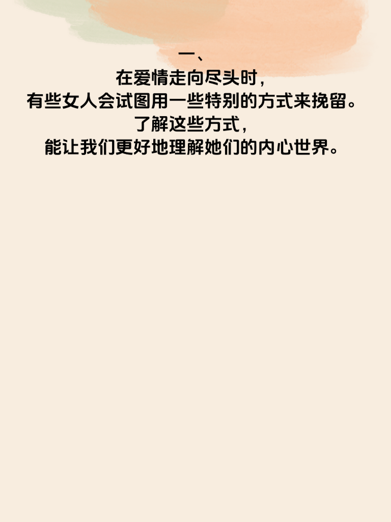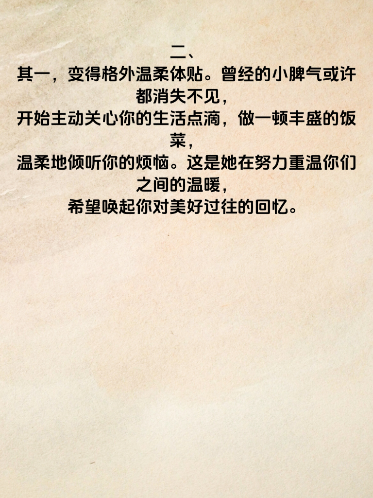 一、在爱情走向尽头时,有些女人会试图用一些特别的方式来挽留。了解这些方式,能让我们更好地理解她们的内心世界。 二、其一,变得格外温柔体贴。曾经的小脾气或许都消失不见,开始主动关心你的生活点滴,做一顿丰盛的饭菜,温柔地倾听你的烦恼。这是她在努力重温你们之间的温暖,希望唤起你对美好过往的回忆。 三、其二,频繁提及共同回忆。她会常常说起你们一起去过的地方,做过的有趣事情。那些回忆是她心中的珍宝,她想借此提醒你,你们之间有着深厚的情感纽带,不应轻易割舍。 四、其三,主动改变自己。比如开始注重形象,学习新的技能或培养新的兴趣爱好。她希望以全新的姿态出现在你面前,让你看到她的成长和改变,从而重新燃起对她的爱。 五、其四,增加陪伴时间。尽可能地和你待在一起,一起散步、看电影。她想用实际行动告诉你,她珍惜和你相处的每一刻,不想让这段感情就此结束。 六、其五,变得更加善解人意。对于你的想法和需求,她会给予更多的理解和支持。她在努力调整自己,试图找到与你更好相处的模式,挽回这段即将消逝的感情。