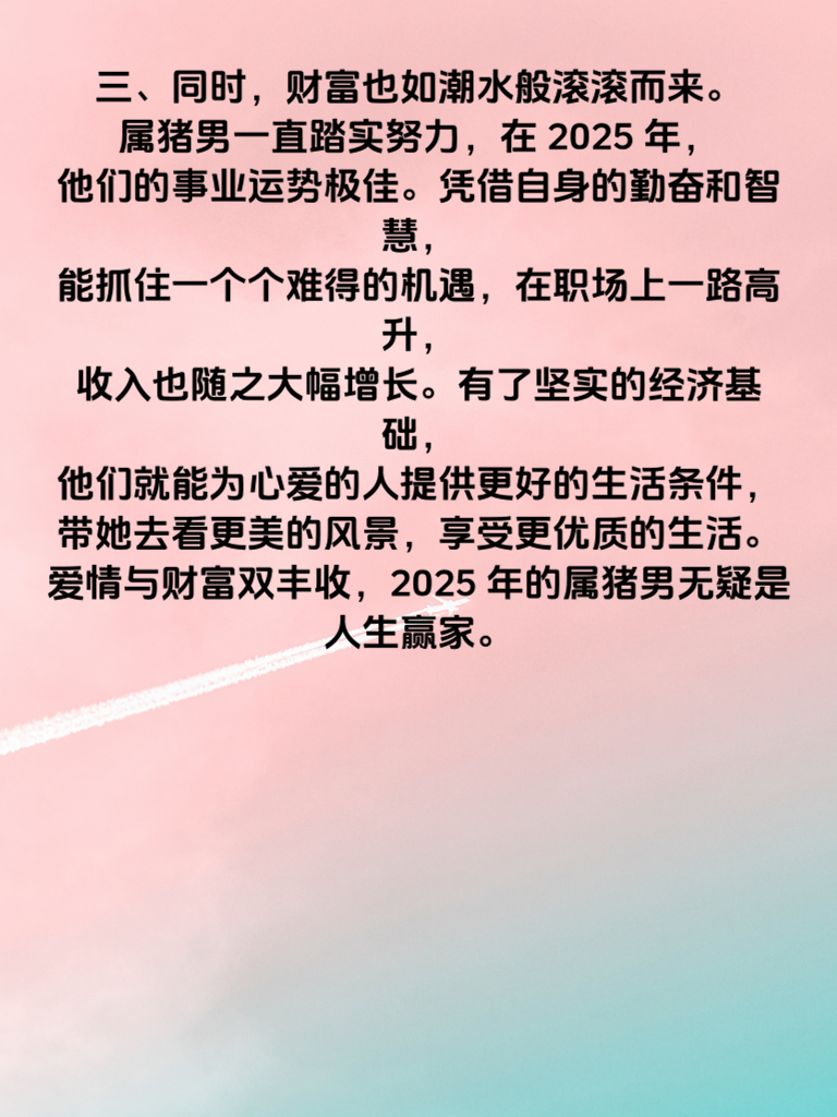 一、2025 年,对于属猪男来说,是充满奇迹与美好的一年。在情感领域,他们将情深似海,收获那梦寐以求的真挚爱情。属猪男本就心地善良、温柔敦厚,在这一年,他们的这些特质会被无限放大。对待心仪的女生,他们会用全身心的爱去呵护,每一个眼神都饱含深情,每一次陪伴都无比温暖。 二、他们懂得倾听女生的心声,能在她烦恼时给予最贴心的安慰,在她开心时一起尽情欢笑。会用心记住女生的喜好,精心准备每一个小惊喜,让爱情在这些细节中绽放出最绚烂的光彩。而且,属猪男在这一年会更加勇敢地表达自己的情感,不再羞涩于说出那三个字,让彼此的感情在坦诚中不断升温。 三、同时,财富也如潮水般滚滚而来。属猪男一直踏实努力,在 2025 年,他们的事业运势极佳。凭借自身的勤奋和智慧,能抓住一个个难得的机遇,在职场上一路高升,收入也随之大幅增长。有了坚实的经济基础,他们就能为心爱的人提供更好的生活条件,带她去看更美的风景,享受更优质的生活。爱情与财富双丰收,2025 年的属猪男无疑是人生赢家。