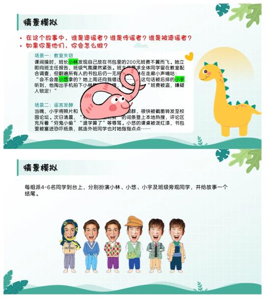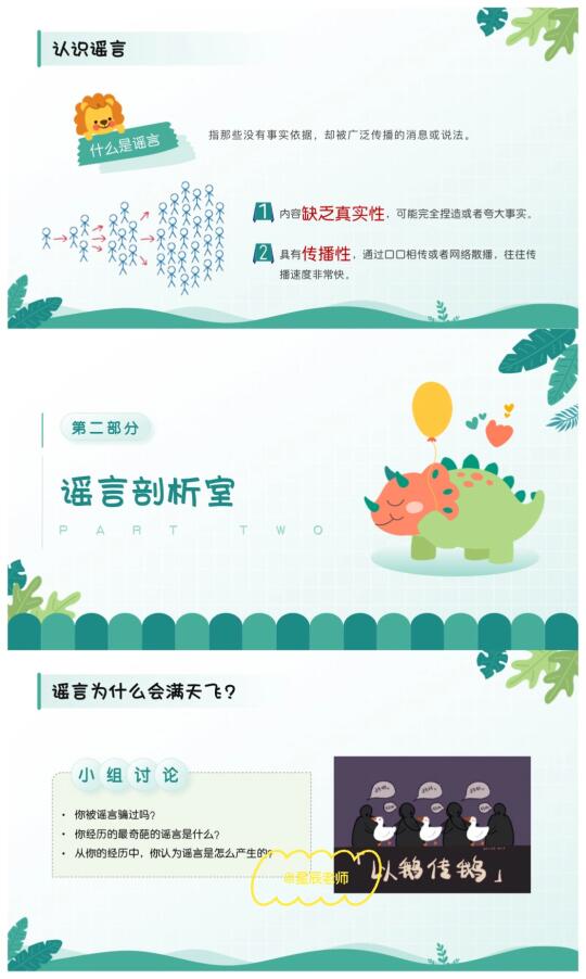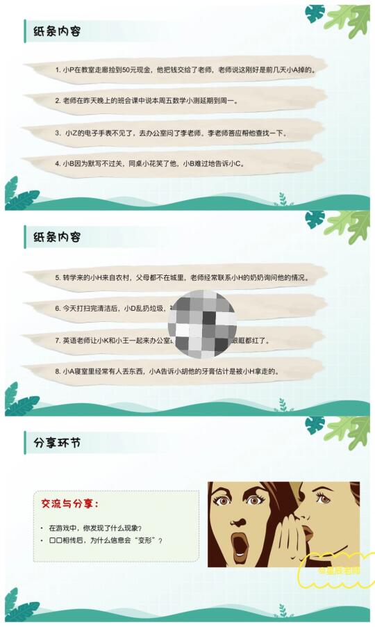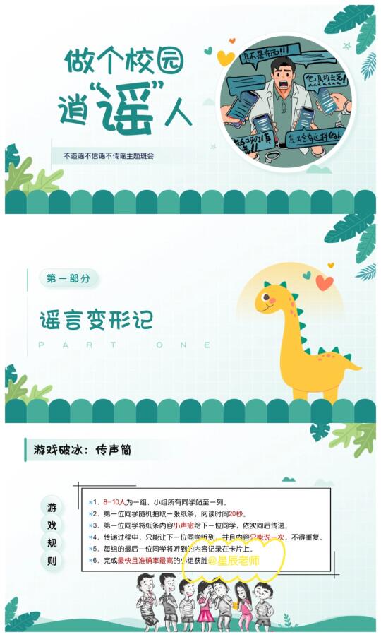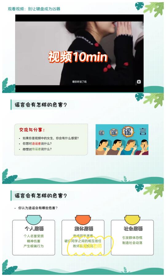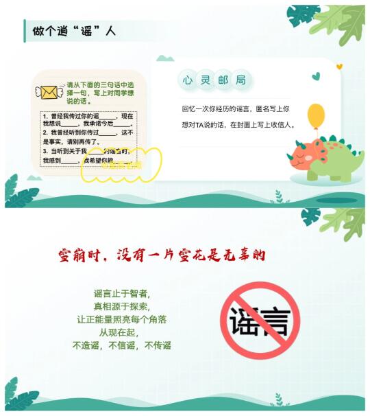 🤬🤬最近班级内又有学生造谣传谣,处理起来真的麻烦😡这节班会课有趣生动又严肃,让学生明白: 雪崩时没有一片雪花是无辜的。 🌈班会提纲: 1️⃣谣言变形记(游戏破冰:传声筒📣学生玩high了[偷笑R]) 2️⃣谣言剖析室(了解谣言是怎样产生的,谣言的危害) 3️⃣谣言粉碎机(通过情景模拟🎬让学生扮演造谣者、传谣者、被造谣者) 4️⃣做个逍“谣”人(心灵驿站:给同学写一封信📩)