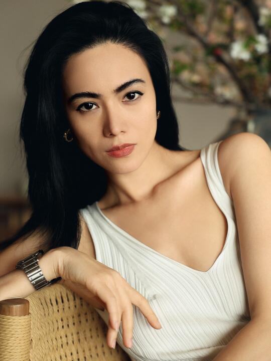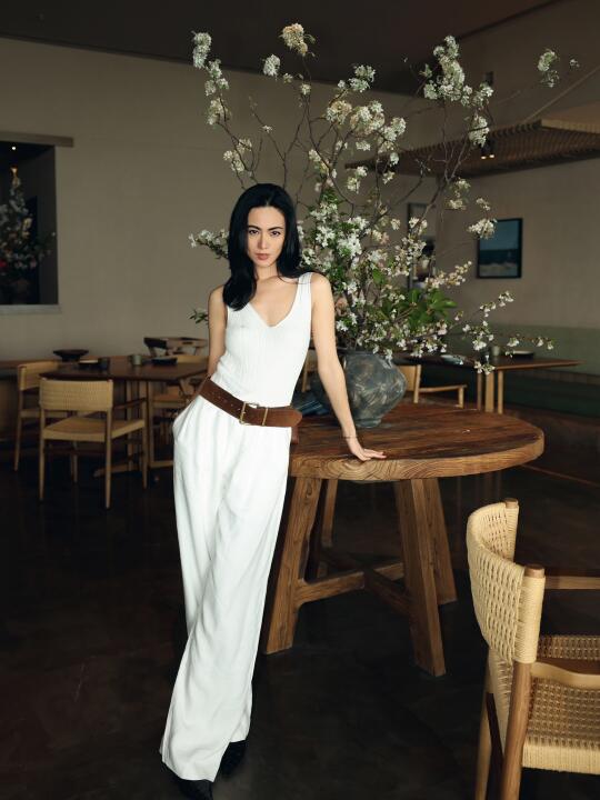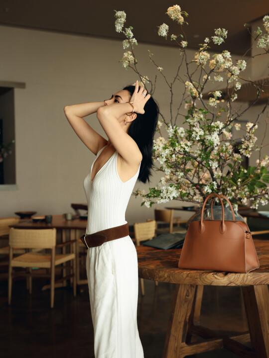 裸色斜肩裙,真的是清爽又不费力的好看。突然很想试试不靠多余装饰、只靠剪裁说