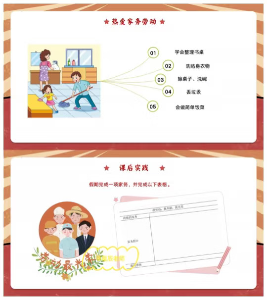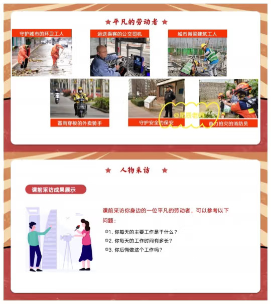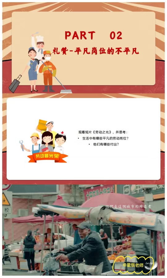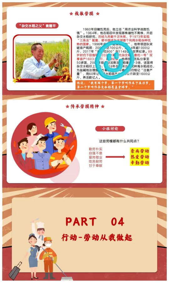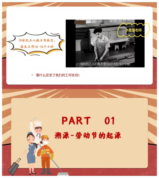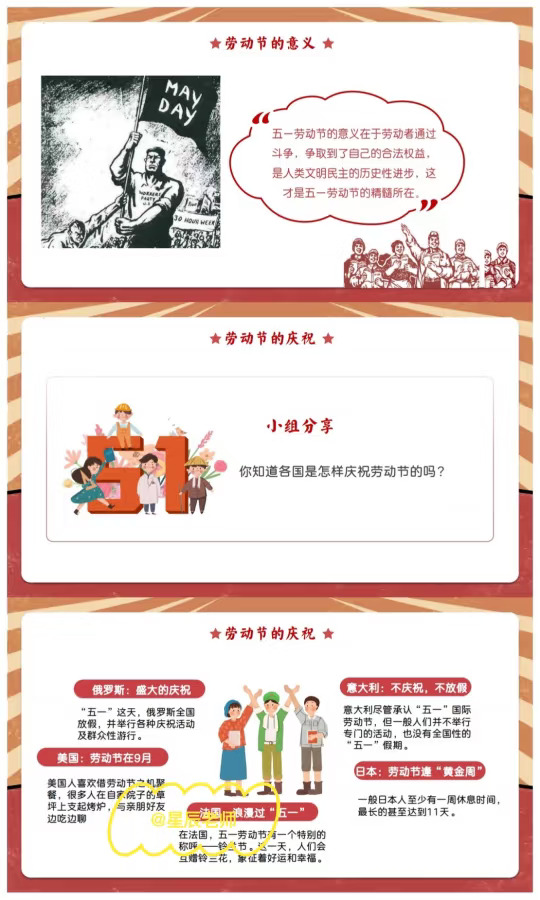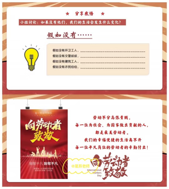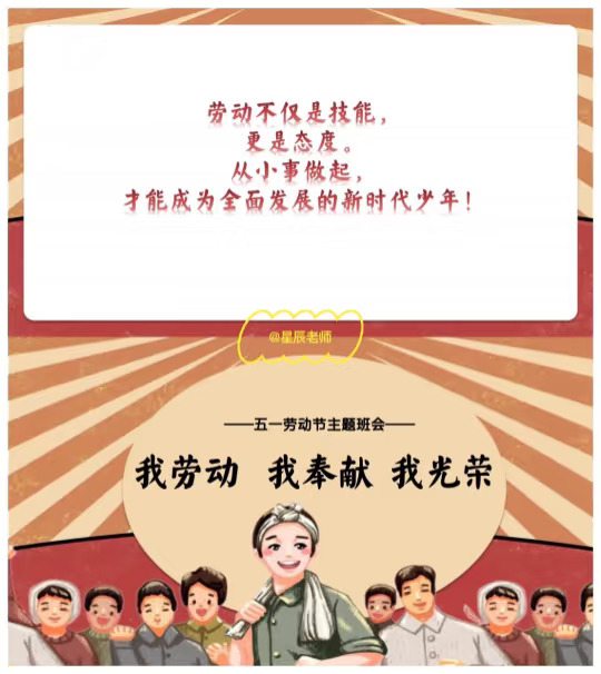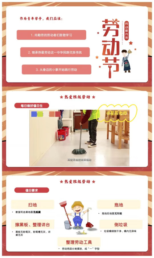 班级学生不爱做劳动🤬每次都要守着做,太偷懒了🤯 开完劳动节班会,教室真的“变样”啦[黄金薯R][黄金薯R] 1️⃣溯源—劳动节的起源[点赞R](通过提问学生关于工作8小时制引出劳动节) 2️⃣礼赞—平凡岗位的不平凡[种草R](学生提前采访身边的普通人,了解工作的不容易) 3️⃣致敬—劳模榜样的传承[集美R](介绍了6位新时代劳模,并总结其精神内核) 4️⃣行动—劳动从我做起[抱拳R](手把手教做教室卫生,以及课后实践作业尝试做家务)