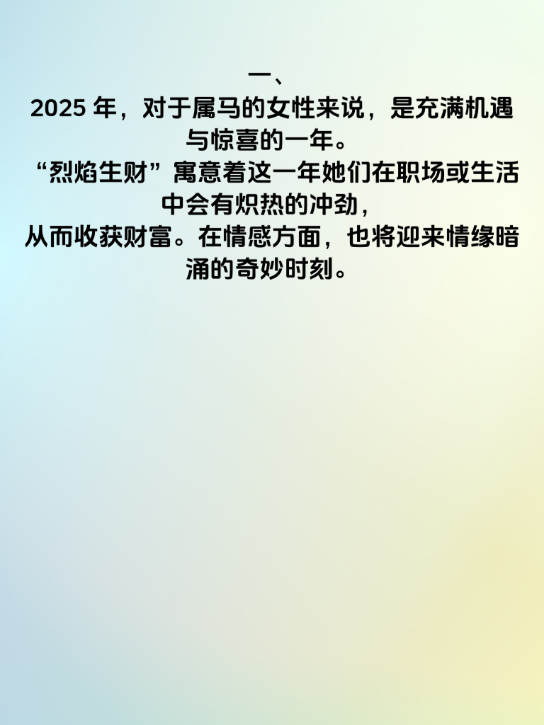 一、2025 年,对于属马的女性来说,是充满机遇与惊喜的一年。“烈焰生财”寓意着这一年她们在职场或生活中会有炽热的冲劲,从而收获财富。在情感方面,也将迎来情缘暗涌的奇妙时刻。 二、属马女热情奔放,她们追求自由,同时也渴望真挚的爱情。在 2025 年,她们的魅力会如烈焰般绽放,吸引众多目光。男生们若想追求属马女,首先要展现出自己的活力与勇敢,与她们一起探索未知,享受生活的乐趣。 三、当面对属马女时,真诚是关键。她们能敏锐地察觉到虚伪,所以要用真心去对待她们。不妨在生活中给予她们支持,在她们为事业拼搏时,做那个默默鼓励的人。 四、此外,与属马女相处要尊重她们的独立。不要试图束缚她们,而是要与她们并肩前行。在这一年,抓住情缘暗涌的机会,用你的爱与关怀,走进属马女的内心世界,共同书写美好的爱情篇章。