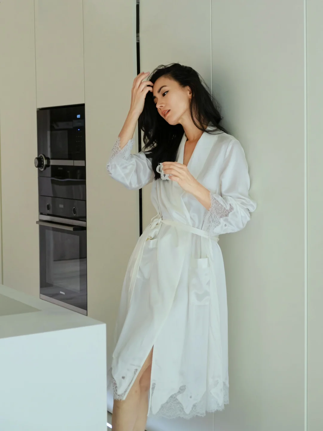风拂柳,粉樱绽放,我身着浅粉蕾丝旗袍,立于古栏之下。长袖轻笼,盘髻缀珠,耳坠摇曳
