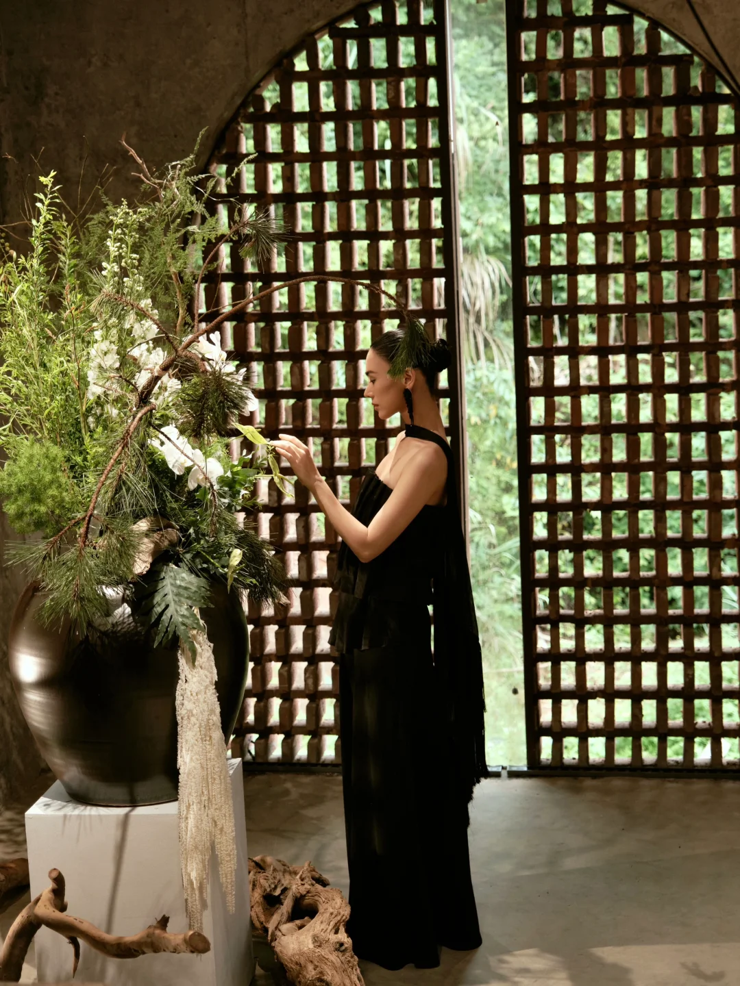 风拂柳,粉樱绽放,我身着浅粉蕾丝旗袍,立于古栏之下。长袖轻笼,盘髻缀珠,耳坠摇曳
