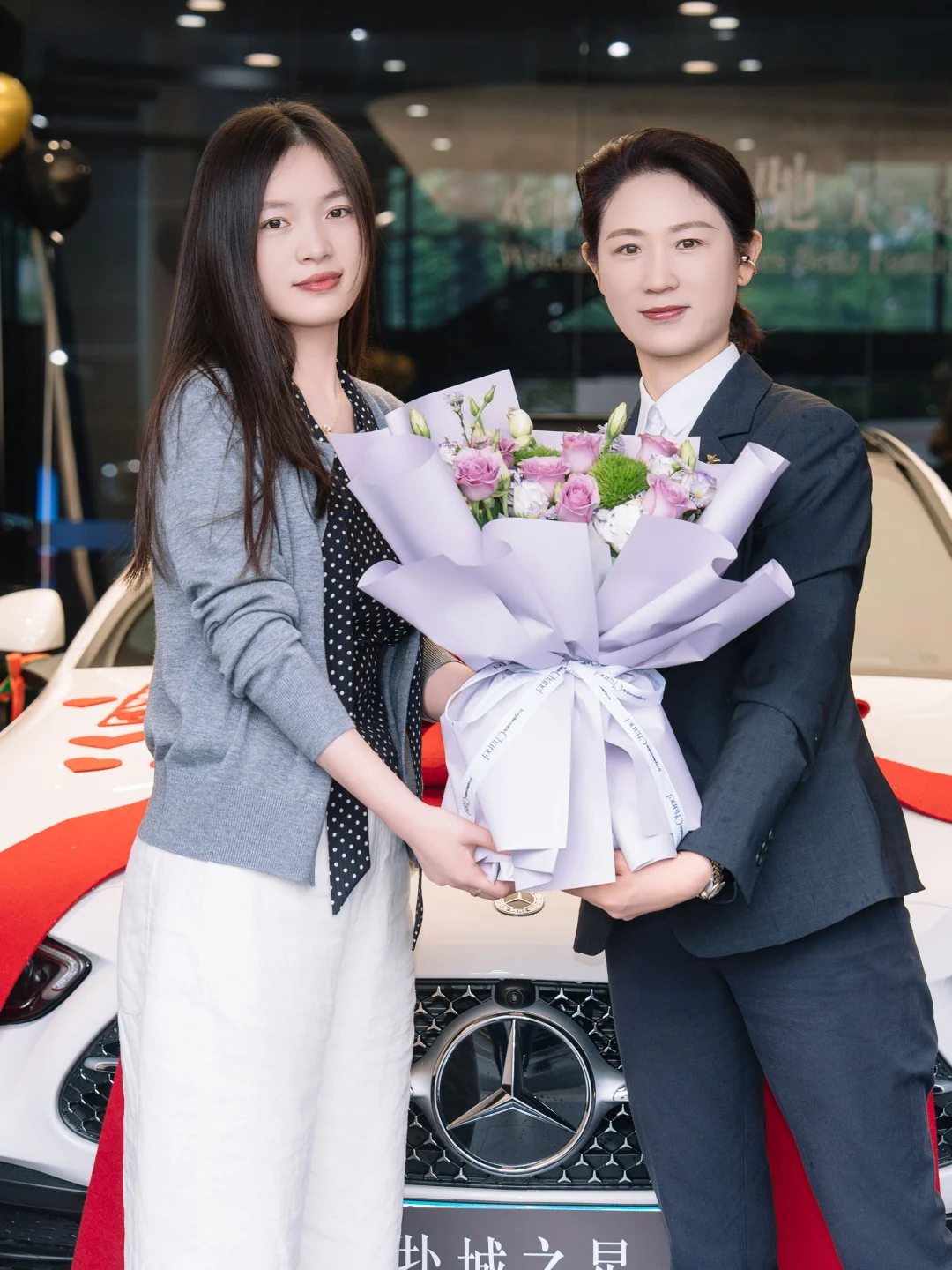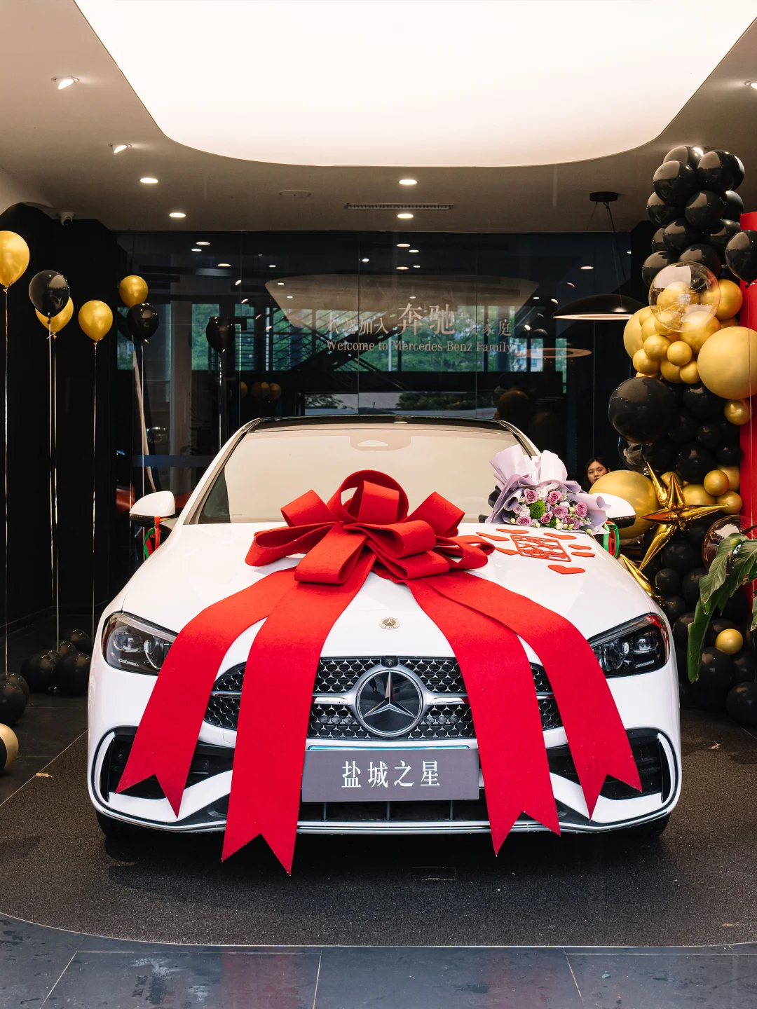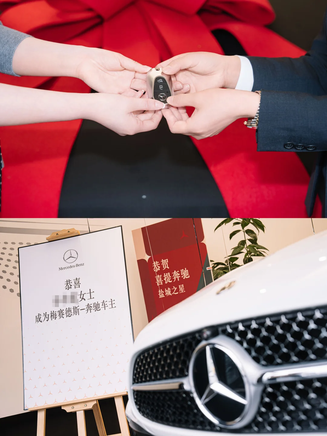 让我们恭喜她喜提奔驰[庆祝R] 成为尊贵的梅赛德斯-奔驰车主[派对R] 愿三叉星辉照亮你的事业与前程[星R] 奔驰 奔驰C 乐享奔驰 何以奔驰惟有奔驰 交车仪式