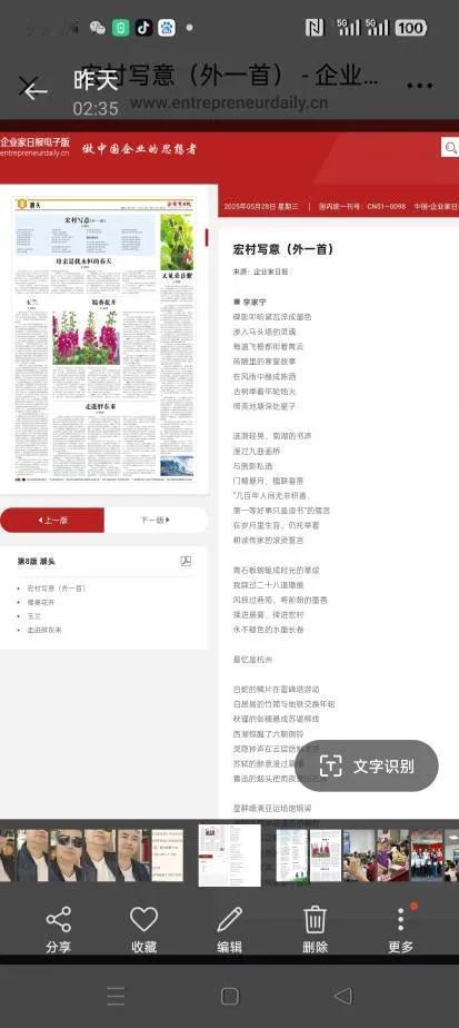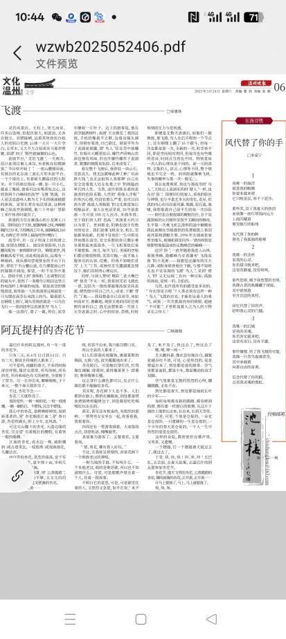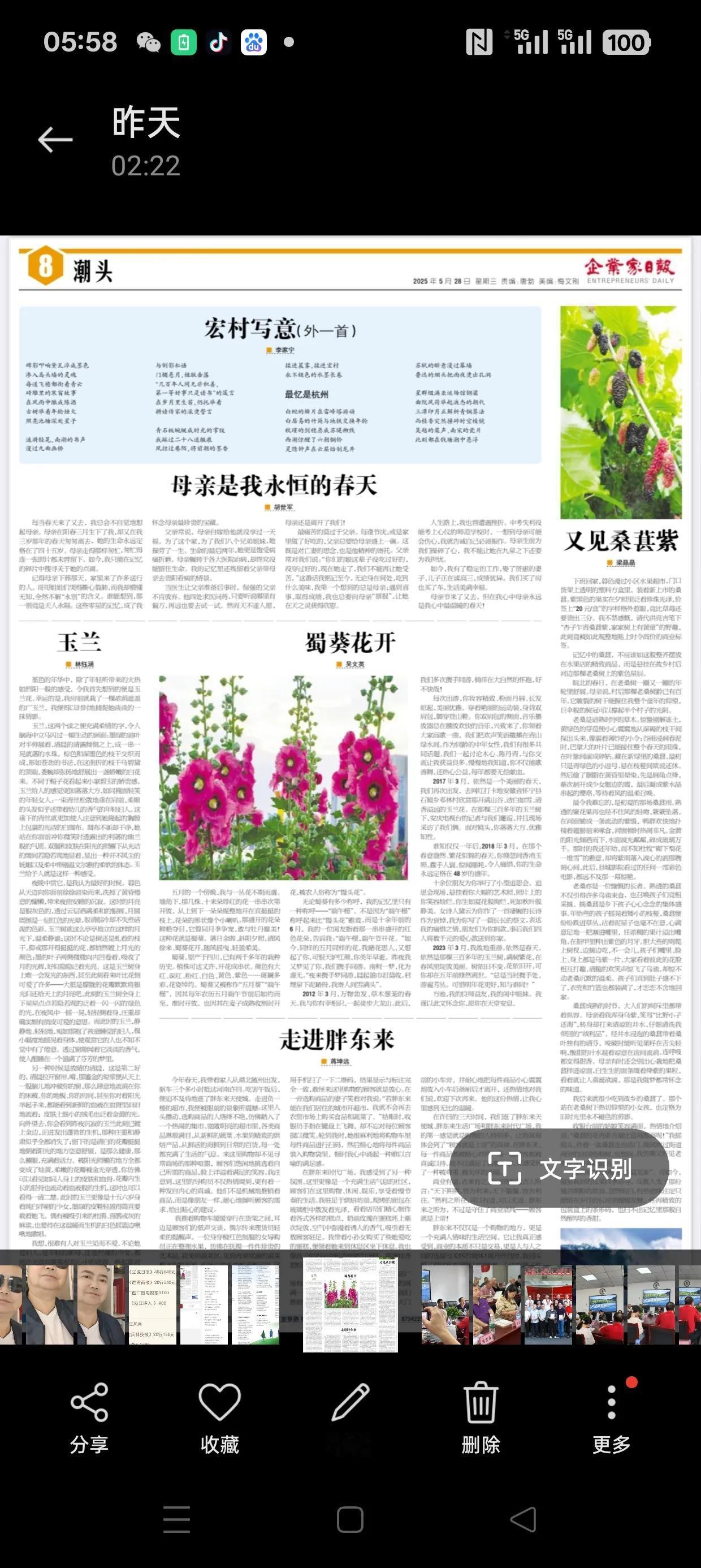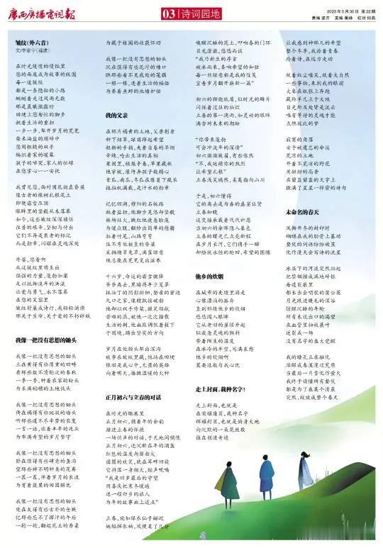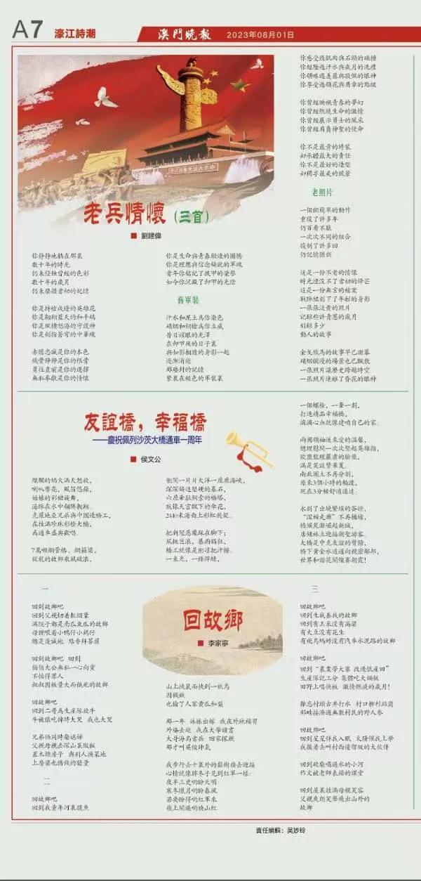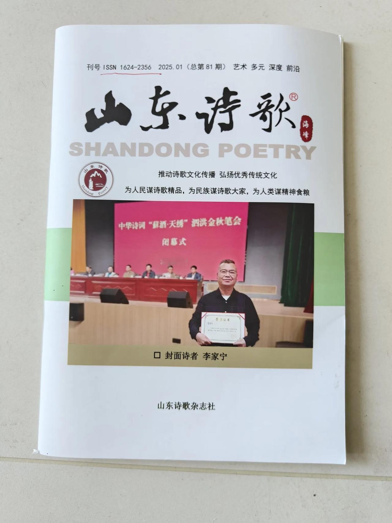 李家宁在报刊上发表27首诗(现代诗): 1、《面对大海》发表于《北海日报》2023、8、11 2《宏村写意》(外一首)发表在《中国企业家日报》2025、5、28 3、《皱纹》(外六首)发表在《广西广播电视报》2025、5、30 4、《风代替了我的手》发表在《温州日报》2025、5、24 5《与迎客松互为倒影》《禾雀花》发表在《辽源日报》2025、5、11 6、《千里走单骑的云朵》发表在 《西南商报》2025、5、20 7、《回故乡》发表在《澳门晚报》2023、8、3 8、《脱身的渡口》发表在《辽源日报》 9、《冰雪世界长白山》发表在《中国旅游报•副刊》(2024年11月28日) 10、《台湾好报》两首: 《春天印刷一桢桢油画》 《雨中抒怀》)(李家宁) 11、《欧洲诗人》(《故乡高仿》)(李家宁) 12、《世界华人周刊》两首: 《海浪张着嘴 吻着热恋的土地》《2022这一年》 13、《香港诗人》五首: 《在翡翠这页宣纸上写诗》 (2024•夏季号)第46期 《把诗写在五岳上》 (2024•秋季号)第47期 《挂在苍穹上的香港》 (2024•冬季号)第48期 《政和八闽鸟:时光的羽痕》 (2025•春季卷)第49期 《迎客松的独白》 (2025•夏季卷)第50期