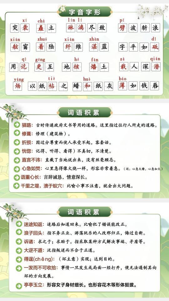 ⭐️课件内容:依旧分为六个专题板块,整合制作,复习更高效!①基础知识---包括字词积累、课文梳理、语法知识,共45页;②古诗词复习---包括《古代诗歌五首》《课外古诗词诵读》,共30页;③文言文复习---包括《短文两篇》《活板》共47页;④现代文阅读共54页;⑤名著阅读---《钢铁是怎样炼成的》共19页;⑥写作复习共9页,课件总共216页,非常全面!
