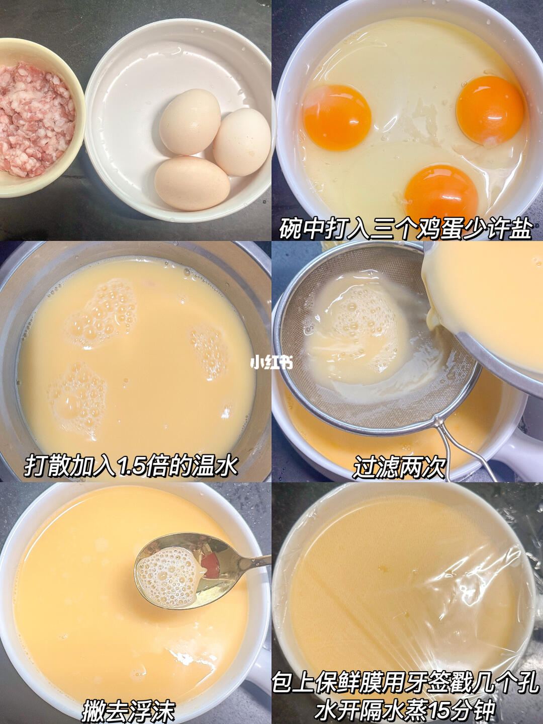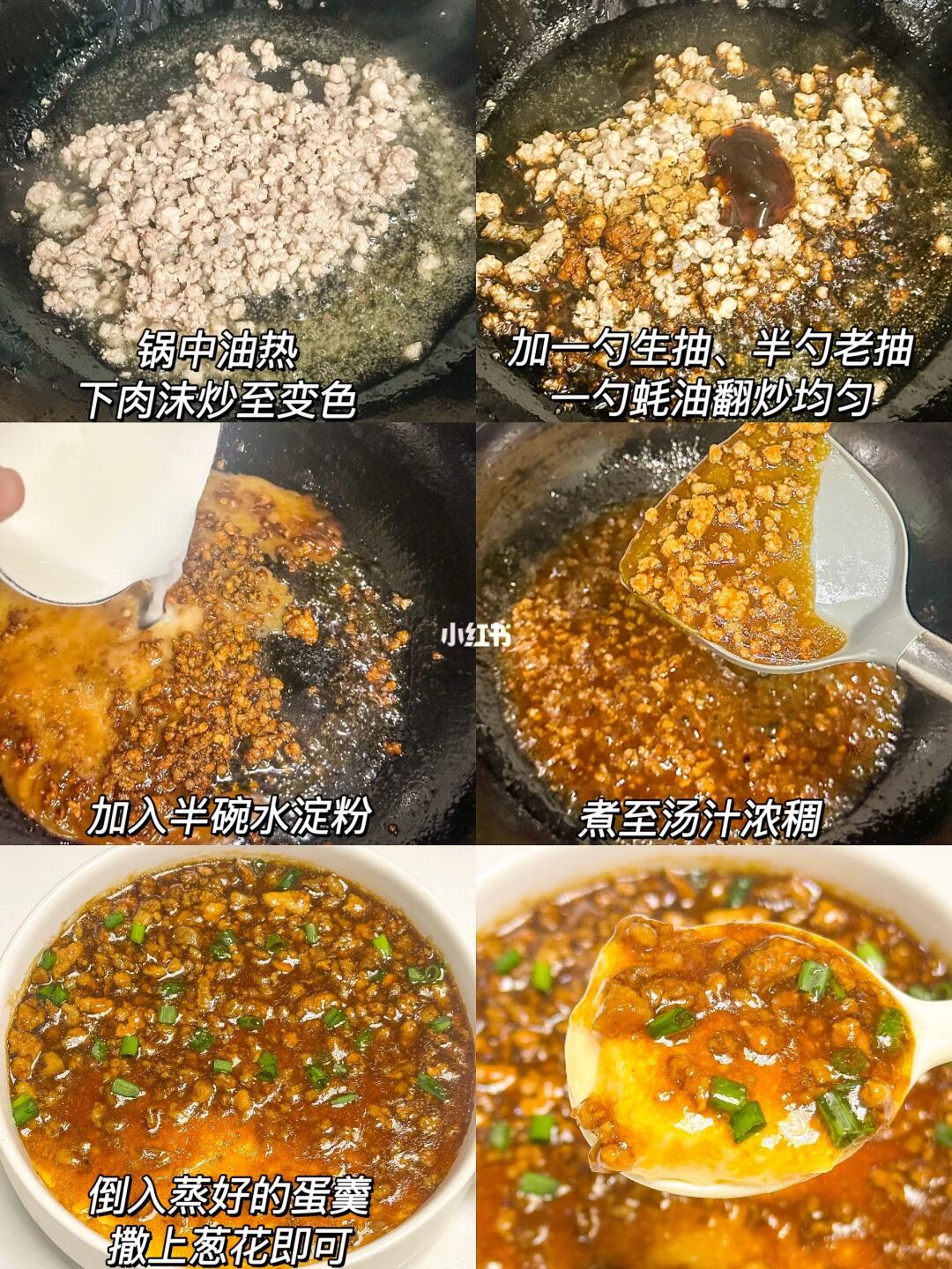 老少皆宜的肉沫蒸鸡蛋🥚营养丰富,鸡蛋入口即化,Q弹嫩滑!做法又简单,快来做起来☺️ 🌟准备食材🌟 鸡蛋三颗、肉沫、葱花 🌟做法🌟 1️⃣碗中打入三个鸡蛋少许盐打散,加入1.5倍的水,过滤两遍,撇去浮沫,包上保鲜膜用牙签戳几个孔,水开隔水蒸15分钟 2️⃣锅中油热,下肉沫炒至变色,加一勺生抽、半勺老抽、一勺蚝油翻炒均匀,加半碗水淀粉,煮至汤汁浓稠倒入蒸好的蛋羹,撒上葱花即可