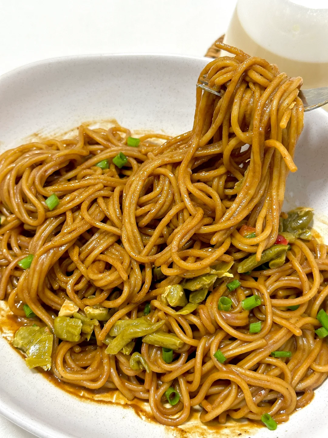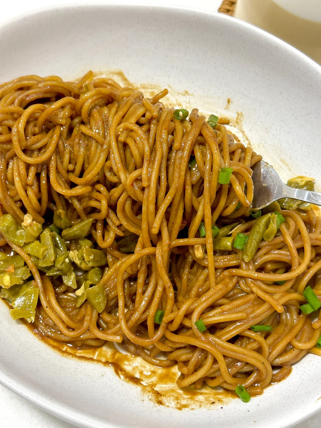 2️⃣面条捞出沥干装碗依次倒入芝麻酱、调味粉、调味汁搅拌均匀再加入酸豆角和辣油搅拌均匀即可开吃