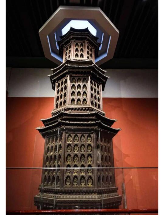 金丝楠木塔原藏于故宫慈宁宫大佛堂,乾隆年间建造。金丝楠木建造的最大佛塔,高约6米,重4吨。佛塔八面三级重檐,周身镶嵌着304个佛龛,每个佛龛里都供奉着一尊鎏金菩萨。