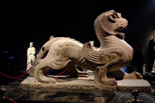 东汉石辟邪,1992年在孟津区出土,高1.9米,长2.97米、宽0.9米,重近8吨,由一块完整的青石雕凿而成,是国内最大的石辟邪。