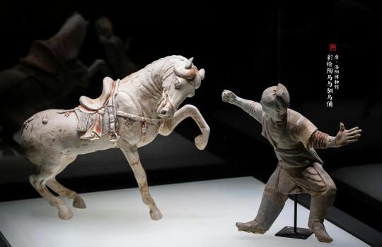 唐三彩骏马与驯马俑,1978年在洛阳出土。骏马躯体伟岸匀称,左前腿凌空踢出,张口嘶吼,想尽力挣脱缰绳的羁绊。驯马师两腿跨立,牵引着缰绳,正在与骏马对峙僵持。驯马俑与陶马互相衬托,构成了一副勇士与骏马、力量与气势互相辉映的场面。