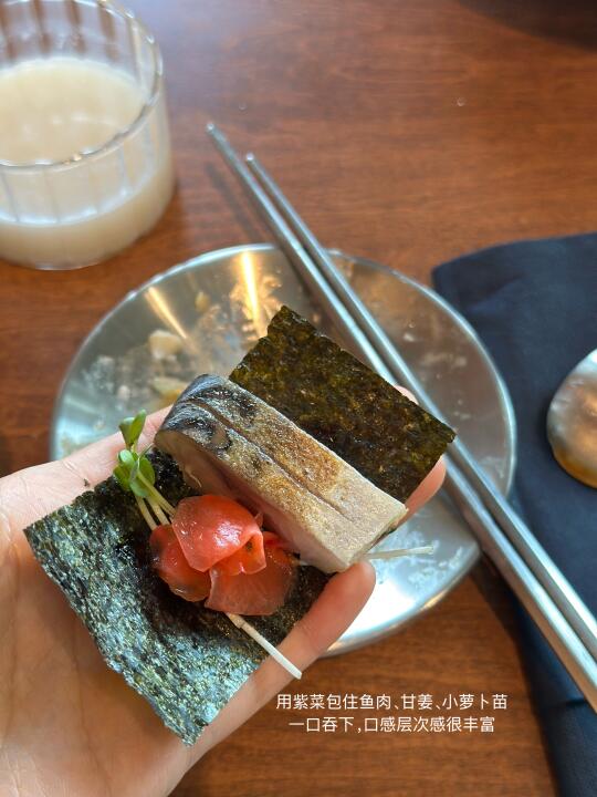 ▫️醋渍鲭鱼:超级好吃,用紫菜包住鱼肉、甘姜和小萝卜苗,一口吞下,口感层次很丰富