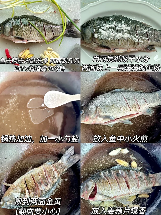 1️⃣鱼去鳞去内脏洗净,两面划几刀,加1勺料酒腌15分钟,用厨房纸吸干水分,两面抹上一层薄薄的生粉