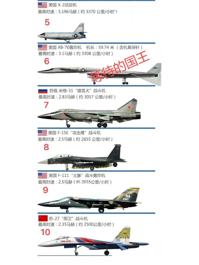 如图所示,国外最快的“十大战机”简介一览图。美国不仅上榜7款,还霸占了前三的位置。特别是第一款最高时速达到6.7马赫,也就是每小时可以达到7200公里。如果你还没有感到吃惊的话,那么就把单位换算成秒,就是一秒2000米。什么概念,也就是在你眨眼这一瞬间,它已经在2000之外。