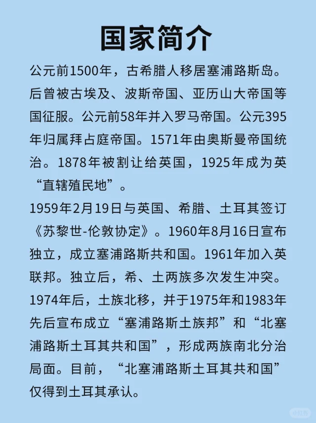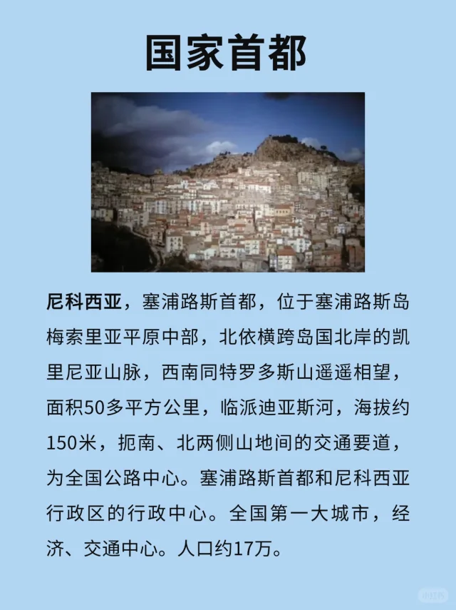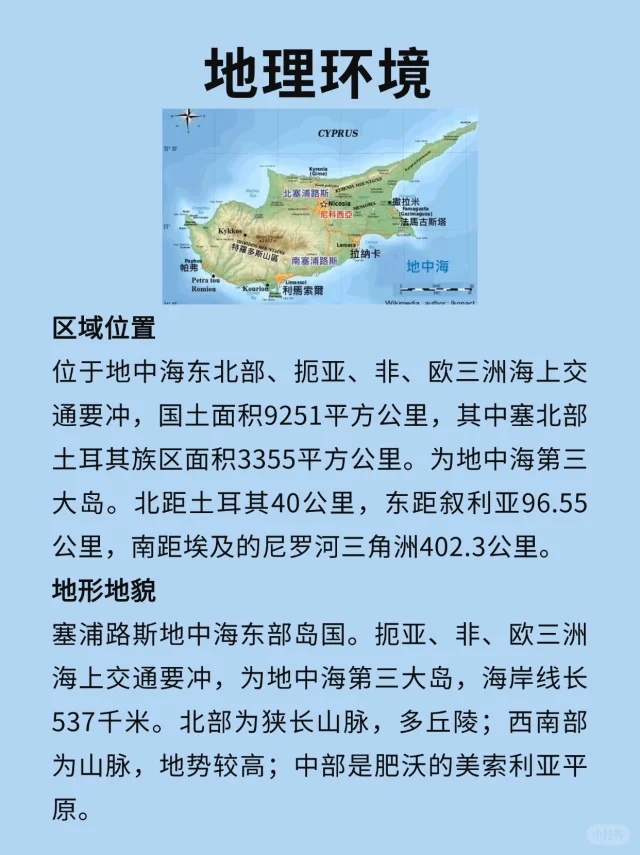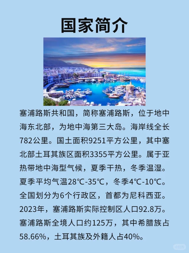 [打卡R]塞浦路斯共和国,简称塞浦路斯,位于地中海东北部,为地中海第三大岛。海岸线全长782公里。国土面积9251平方公里,其中塞北部土耳其族区面积3355平方公里。 [彩虹R]属于亚热带地中海型气候,夏季干热,冬季温湿。夏季平均气温28℃-35℃,冬季4°℃-10℃℃。全国划分为6个行政区,首都为尼科西亚。 [向右R]2023年,塞浦路斯实际控制区人口92.8万塞浦路斯全境人口约125万,其中希腊族占58.66%,土耳其族及外籍人占40%。