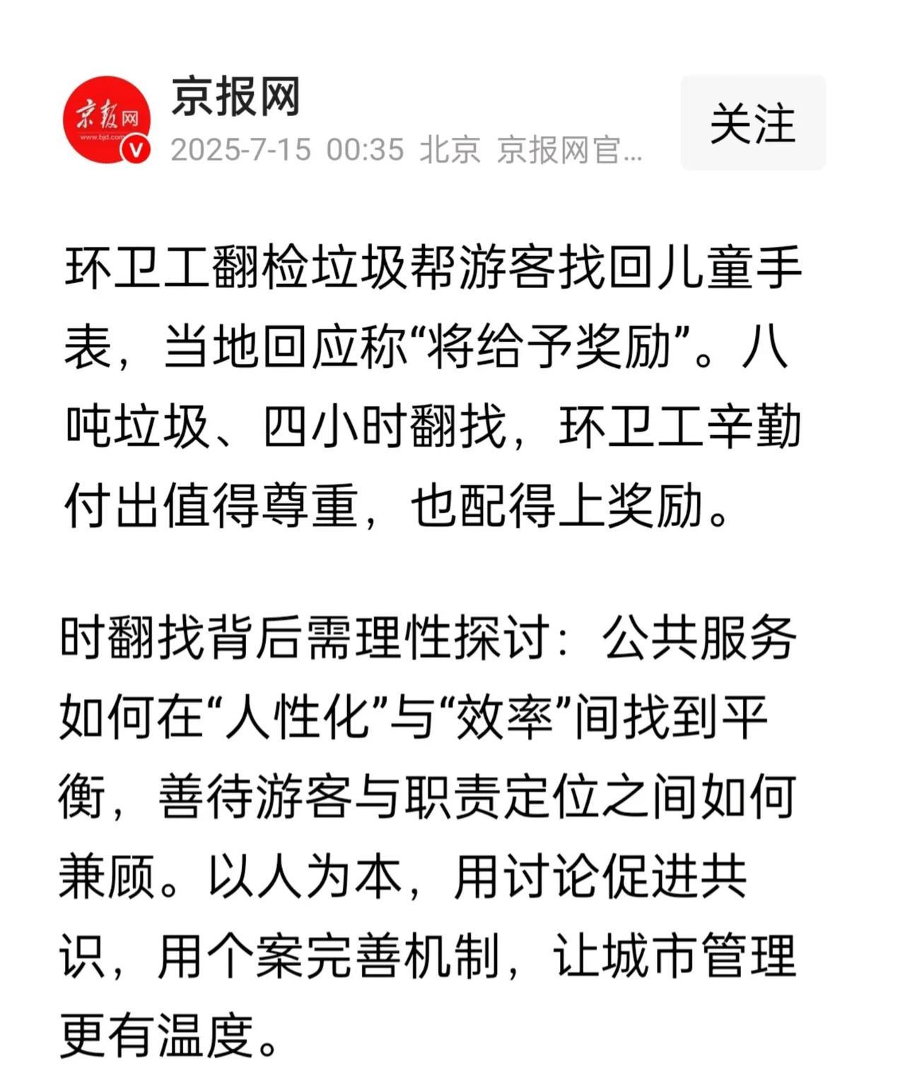 用时四个小时,翻捡八吨垃圾,只为寻找游客丢失价值1200元的儿童手表,到底值不值? 这么热的天,气温这么高,游客自己不小心丢失了儿童手表,却动用公共资源,耗时四个小时寻找。两名环卫工人该得到奖励,环卫领导却应该受处罚。 个人的过错,凭什么要集体买单。价值1200元的手表,与翻遍八吨臭烘烘的垃圾相比,谁的成本更高。 我认为,过错在游客自己,动用公共资源帮助游客虽然应该。但是,所有成本,应该由游客个人承担,而不应该由公家买单。
