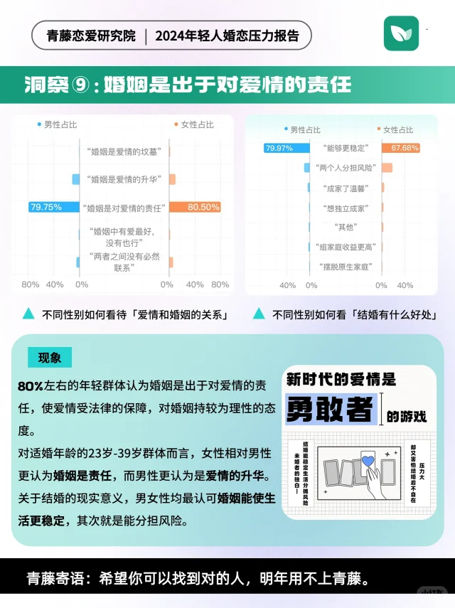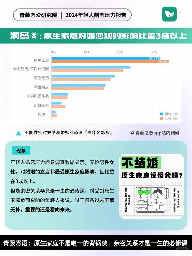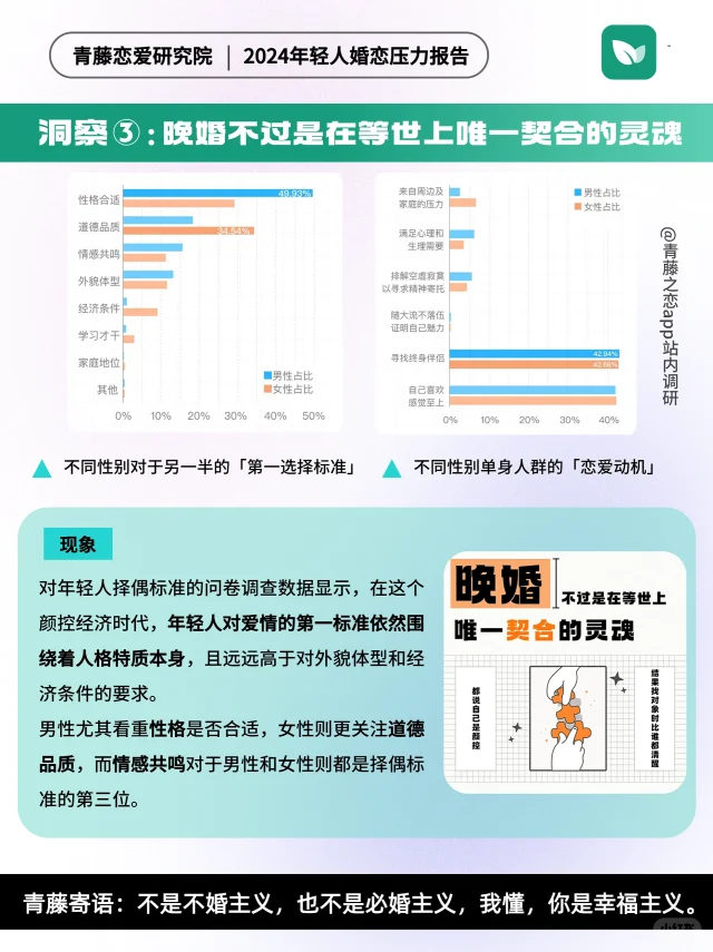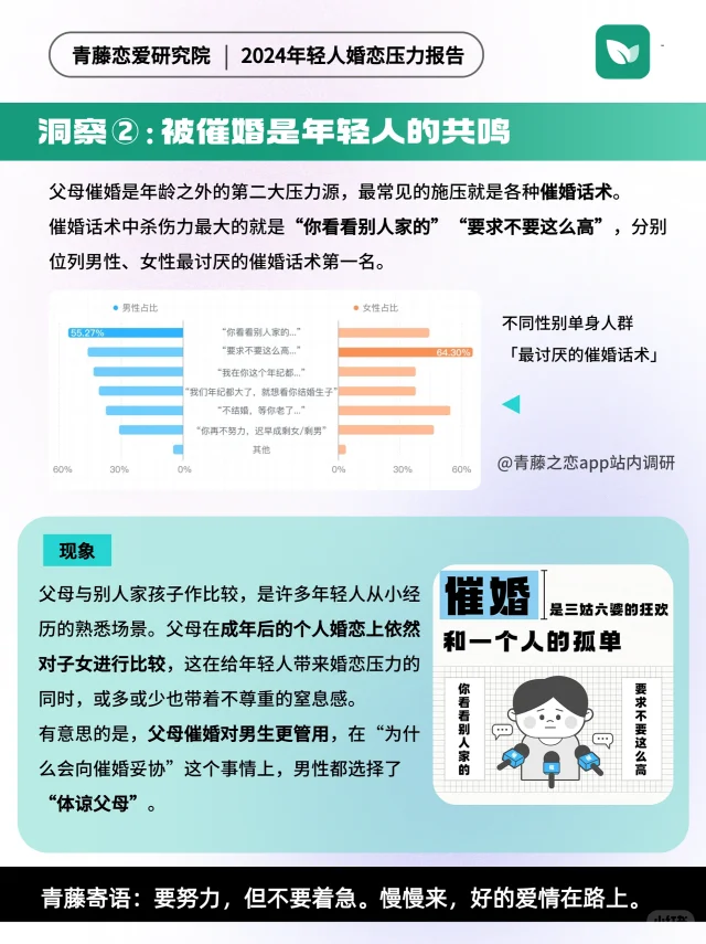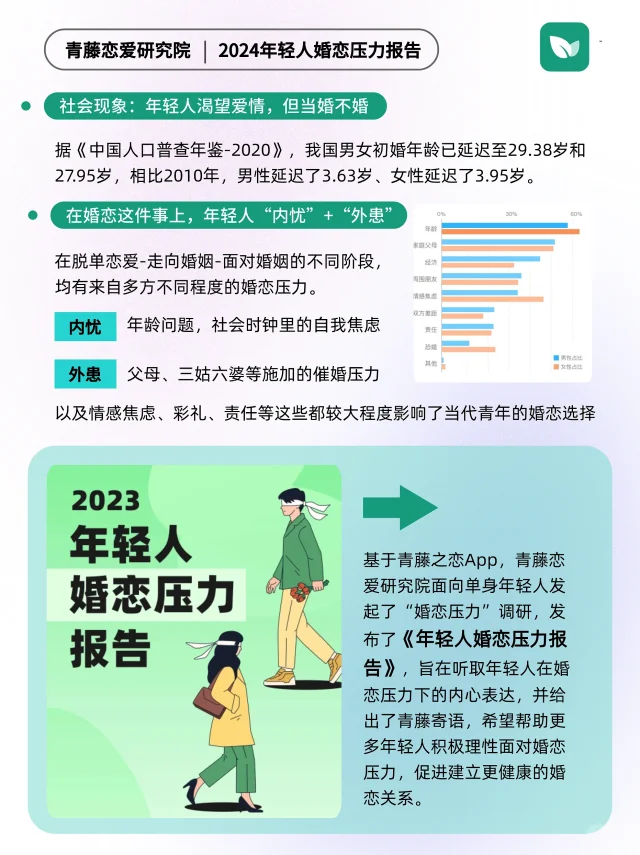 这份报告旨在听取年轻人在婚恋压力下的内心表达,并给出了青藤寄语,希望帮助更多年轻人积极理性面对婚恋压力,促进建立更健康的婚恋关系[两颗心R]