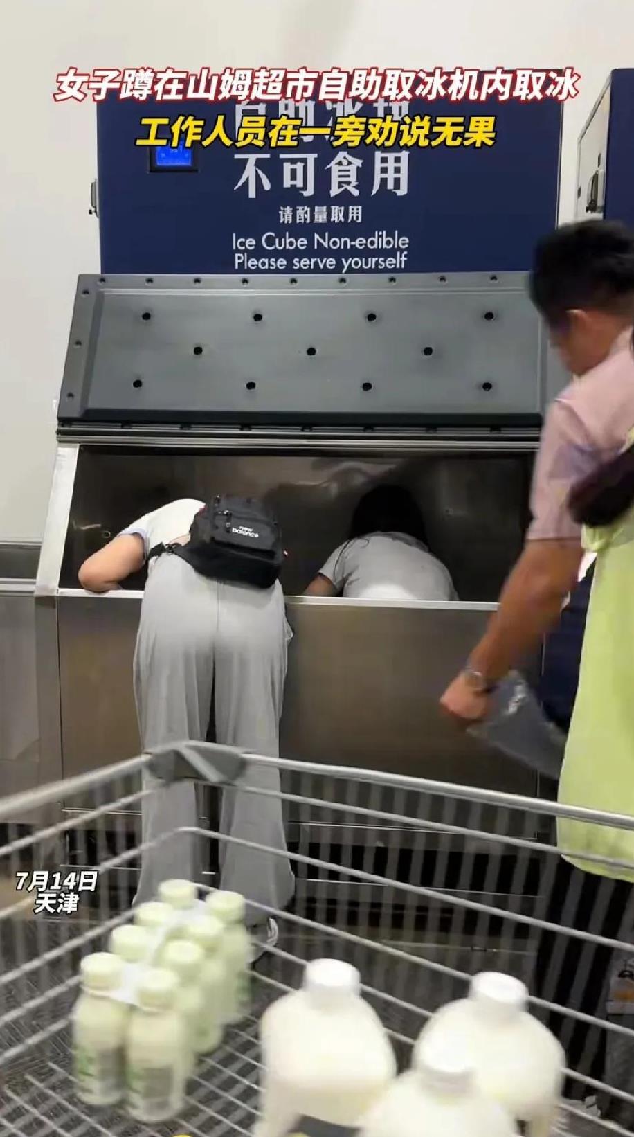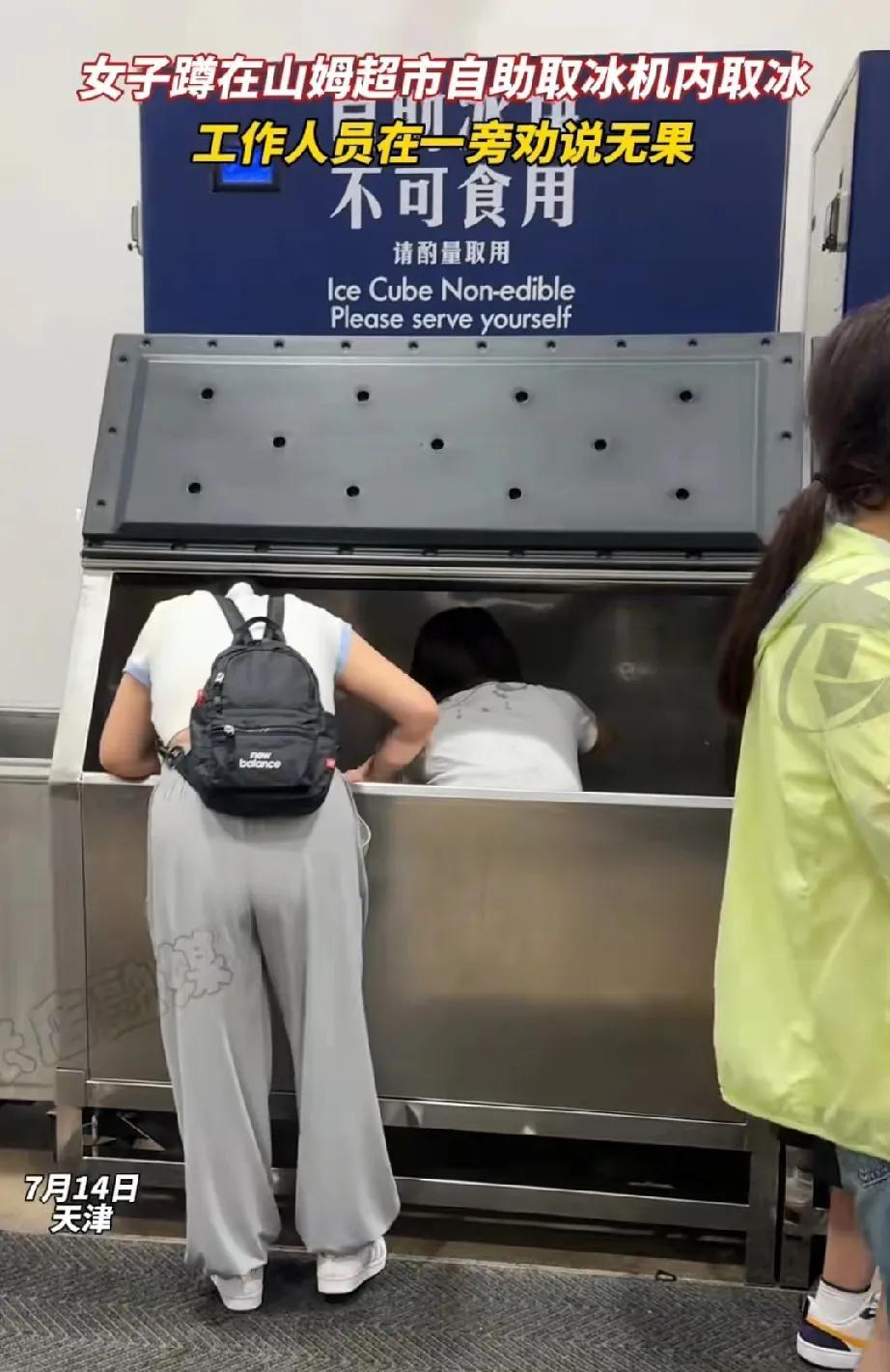 女子蹲在山姆制冰机里取冰,工作人员在一旁劝说,女子根本不听,继续蹲在里面取冰。