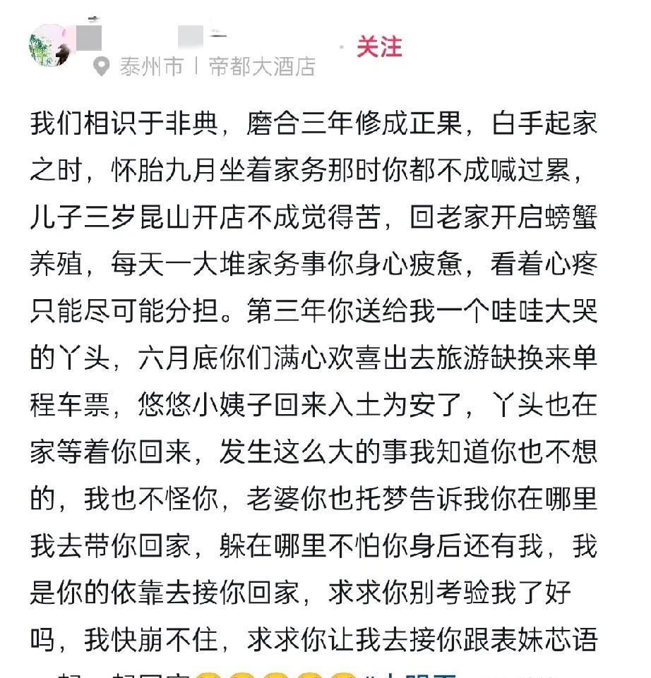 “老婆你们到底在哪给我托个梦吧!”神仙眷侣,催人泪下,大明玉老公怀念她们曾经的爱情,邂逅于2003年,3年恋爱磨合,终于修成正果。 儿子3岁时,去昆山开店不成后,返回老家养螃蟹,养螃蟹的第3年,女儿出生。 从此儿女双全,命运的齿轮开始转动,渐渐,生活开始慢慢变好起来。 大明玉老公在文中透露,小姨子和悠悠已经入土为安,他们的小女儿也在老家等着她(一起安葬)。 他求大明玉不要再“躲”了,能够托梦给他,她们到底在哪里? 好让他带大明玉和表妹及芯语回家,他也不怪老婆,毕竟她也不想这样的事发生,让老婆别考验他了,自己已经快崩溃了。 @猿方有看法 这里希望大明玉和表妹以及那个小女孩能够尽快被找到。