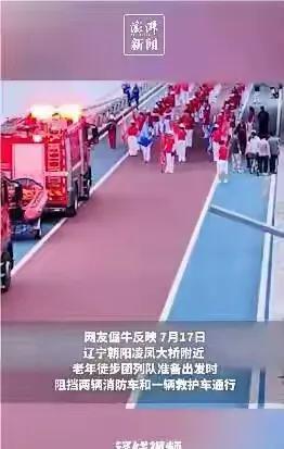 这样的健走团与路霸有何区别?7月17日发生在辽宁朝阳凌凤大桥附近老年健走团逼停两辆消防车和一辆救护车,人们不禁要问,是谁给组织者和其成员的权力? 健走团为了健身而占道堵塞交通已不是什么新鲜事,但是明目张胆占道同时逼停消防车和救护车还真的发生了,大家都知道消防车出警意味着什么,那是水火无情,而这两种车辆都是为挽救生命和减少各种危险与损失。 事发健未团成员不是不懂利害关系,而是过于自私,并把救火与救人当儿戏,如果仅仅是批评教育只是不疼不痒,这无疑是在助长他们以后的行为,这起事件已经引起广泛关注,大家认为应该采取什么措施才能杜绝此类现象发生?