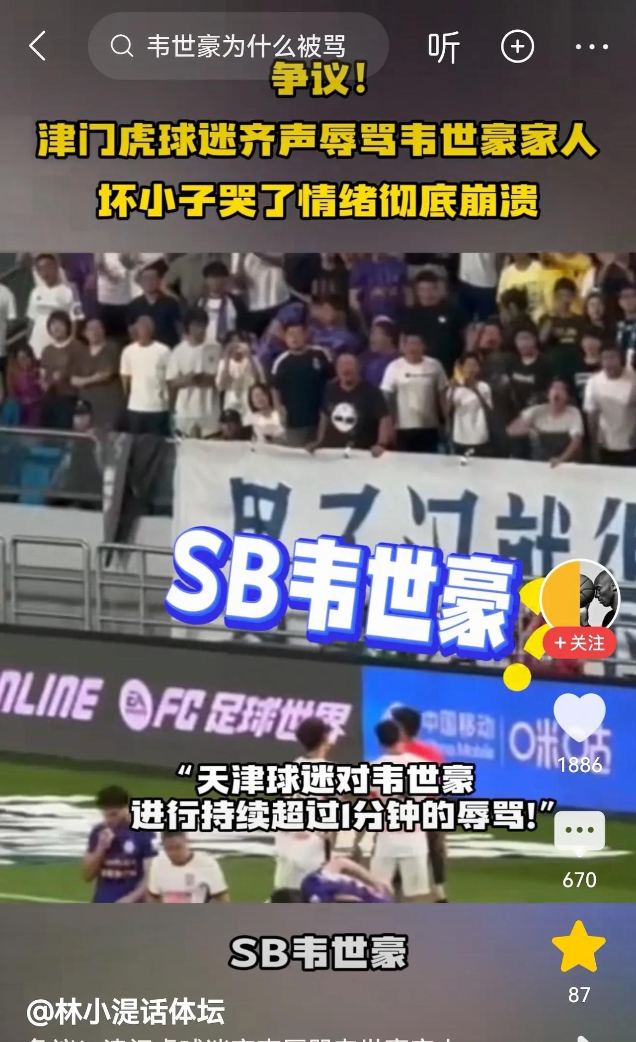 有点看不懂了,好好的赛场变成了骂人的阵地,津门虎球迷齐声“问候”韦世豪家人,韦世
