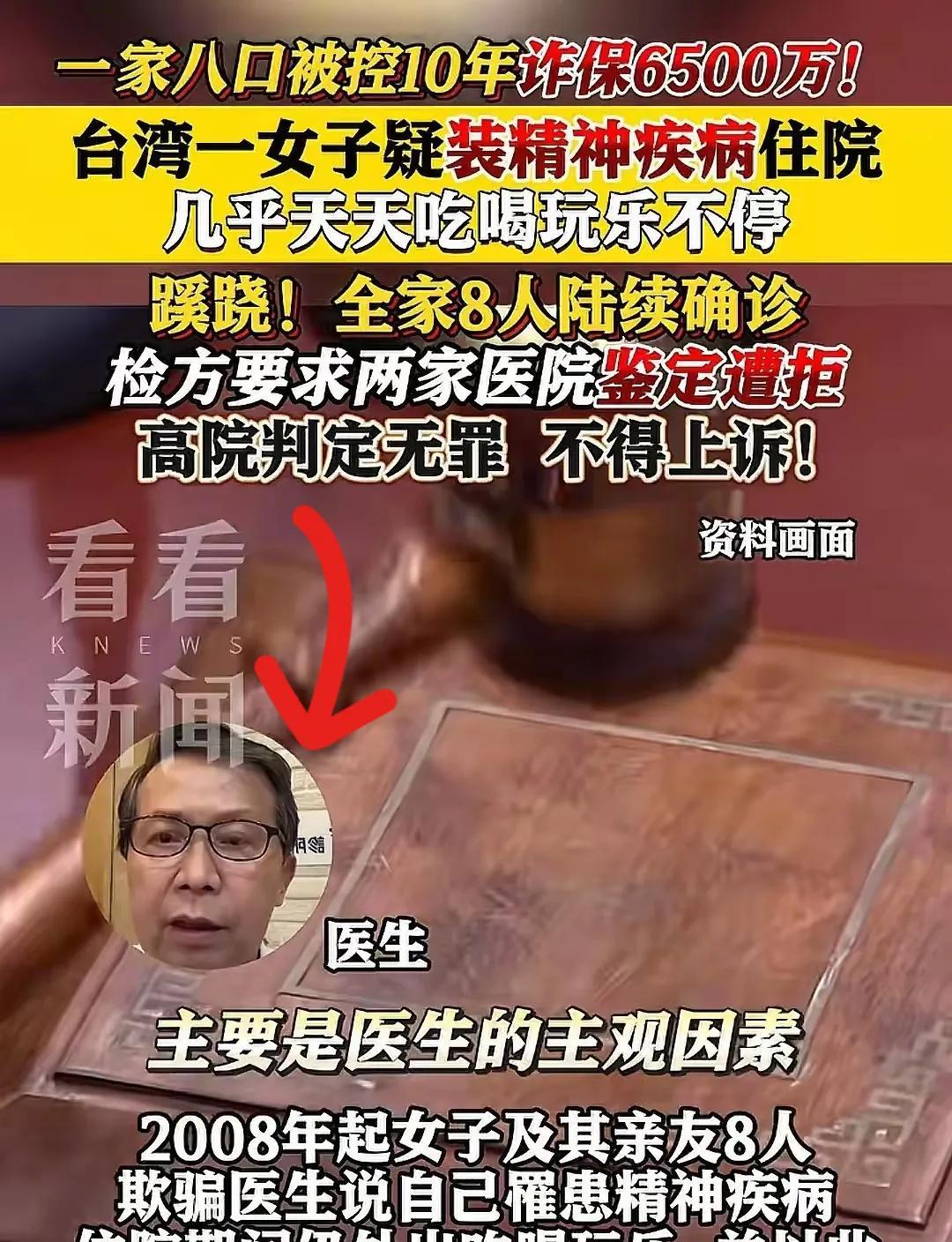 惊掉下巴!一家八口装病骗保6500万,最后居然判无罪! 从2008年起,这家人就开始轮番“表演”忧郁症,各大医院的精神科室都被他们光顾了个遍。 保险公司被薅走5570万新台币,健保也被薅走938万。 警察早就发现他们不对劲了,住院期间吃喝玩乐样样不落,完全不像生病的样子。 可法院却以罪证不足判无罪,理由是医生诊断正规,病历有症状,还说可能是遗传,举报证据弱。 检方上诉也没用,高院终审还是无罪。 这判决真的合理吗?精神病诊断本就复杂,这不是给骗保行为开了绿灯? 以后是不是都能靠装病骗保了?大家觉得这种情况该怎么杜绝,保险公司又该如何防范?