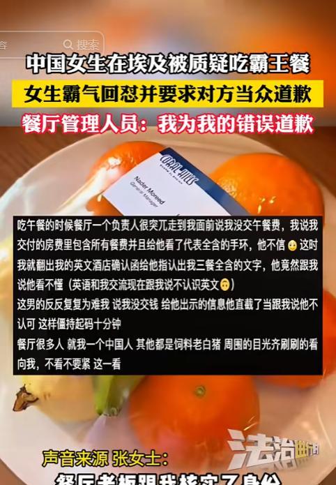 “太给中国人长脸!”3月20日,一位中国女子在埃及的酒店用餐。突然,餐厅经理过来指责女子吃霸王餐,女子拿出证明,谁知道经理故意装作看不懂,执意说女子“白吃白喝”。感受到餐厅里其他外国顾客频频投来的目光,女子直接“血脉觉醒”,结局太舒适了! 根据相关报道,事发地点坐标埃及某酒店,当时正是用餐时间,当时出现在酒店里面的大多都是白人,甚至在女子作为一个黄皮肤的中国人出现在酒店餐厅时,吸引过来的是很多异样的眼光。女子并没有理会,只是拉着自己的行李箱选好座位之后,去拿吃的,准备开始吃饭。 整个过程还算顺利,虽然有奇怪的目光朝着女子投射,但也仅限于此,没有更奇怪的事情继续发生。女子吃的这顿饭是包含在自己订酒店的费用中的,因为当时订酒店的时候,女子为了避免后续麻烦,就直接选择了包含三餐服务的居住套餐,相关函件就被装在行李箱中。 女子正在脑子里面策划吃完饭之后的需要做的事情,结果一名服务员走过来直言她要吃霸王餐,可以说是一盆脏水直接当女子的面泼过来,女子觉得十分莫名其妙,也正是来自这名店员的质问,来自四面八方那种轻蔑、不屑、讽刺的目光越来越多,没有人替她说话,让酒店这边先进行系统确认之后,再进行判断,在场的所有人都在看女子的笑话。 一开始,女子再三表示自己订房间的时候确实包含三餐服务,关于这一点,她在此之前就曾多次和客服工作人员进行过沟通,不可能出错,所以她再三地要求服务员先去酒店系统进行相关确认,但对方丝毫不为所动,满脸地坚定,觉得自己的判断不会出错。 动静之大,酒店老板闻声而来,听完事情的全部经过之后,立即去查看相关情况,了解清楚之后,承认这确实是一场误会,并道歉,女子声音很大,直接表示让刚刚那名员工过来向她郑重道歉才可以。 此事曝光后,有网友觉得女子身在异国他乡,似乎在态度上太强硬了。 关于这一点,女子也作出回应,直言她之所以在道歉环节声音大、义正言辞的,主要是因为她不希望外国人误解中国人,沉默只会造成更大的误会,觉得中国人确实像那位员工所描述的那样,吃霸王餐,严重与事实不符。并且她相信换作任何一个中国人,出门在外都不希望被误解,因为对方会上纲上线,将整个问题上升到民族层面。 网友直言:说这些都没用,重点是为什么中国人在国外这么不受欢迎是值得反思的。 对此,大家怎么看? (参考信源:四川观察)