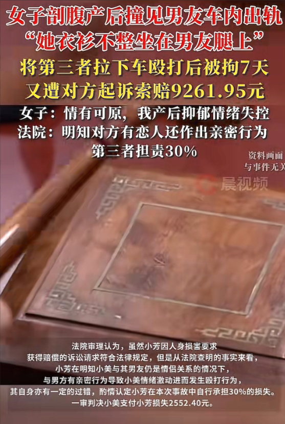 2024年9月20日,徐琦美刚为陈志鹏(化名)生下女儿,满月酒的喜庆还未散尽,丈夫便以"加班"为名频繁夜归。9月25日,她带着亲戚尾随陈志鹏至某商场地下停车场,亲眼目睹其与同车间女工曾芬芳在车内亲密。冲突中,曾芬芳多处软组织挫伤住院6天,出院后索赔9800元,徐琦美则因《治安管理处罚法》第四十三条被行拘。