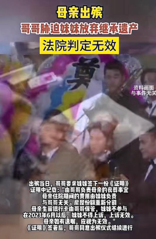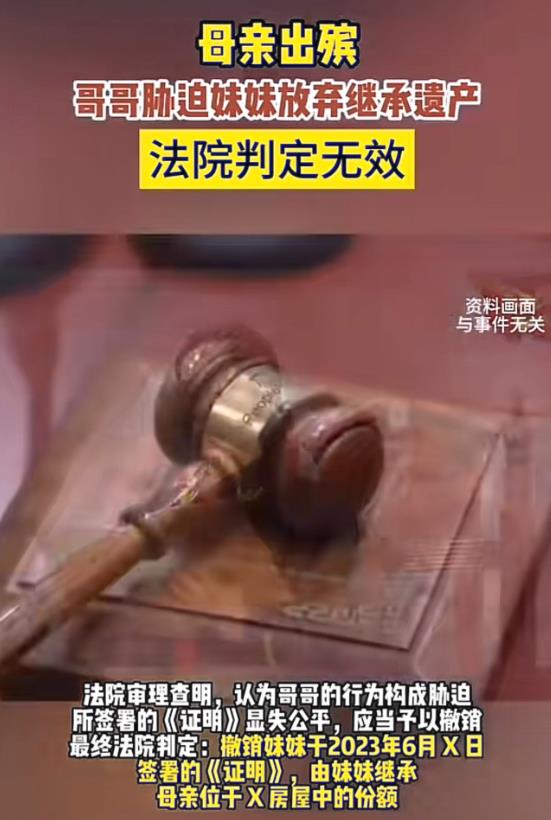 上海,一老妇生前立下遗嘱,将名下房子留给女儿。岂料,老妇去世后出殡当天,其儿子却拦住棺材,要妹妹放弃遗产并签字,如果不签就不能出殡,为让母亲尽快入土为安,只得无奈签字,事后,妹妹将哥哥告上法庭,要求撤销签字的证明,法院这样判! (来源:澎湃新闻)