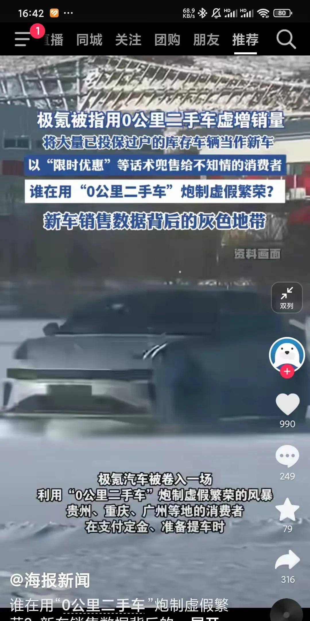 这下好了,国家已经出台政策了,要严格打击0公里二手车,新车上牌后6个月里不允许交易,这样那些刷数据的厂商就不好过了。 这次极氪被爆出了将大量已投保过户的库存车当新车卖,以限时优惠兜售给不知情的消费者,而且消费者买得时候还不知道是二手车,这就是妥妥的欺骗了。 现在新能源竞争越来激烈,很多车企不惜打价格战,一方面要销量数据,一方面又要拿补贴,真是无所不用其极,能用的办法都用了,但销量还是上不去。 新能源汽车已经进入白热化的状态了,单靠价格战,但靠0公里二手车这些套路已经行不通了,还是要在产品技术上下功夫才行,靠忽悠这一套已经过时了。