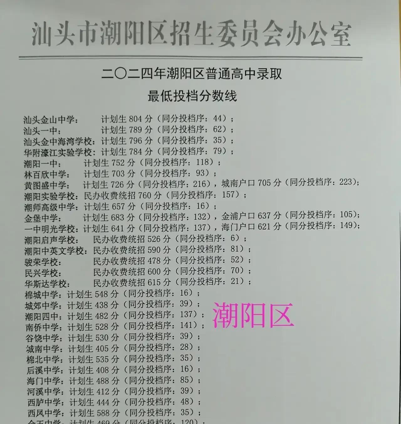 2025年汕头市潮阳区中考的录取成绩,分为四个层次,第一梯队:金中803,汕头一中792,一中757,实验762, 第二梯队:林百欣708,黄图盛731,潮师659,金堡686,明光642,华斯达667。 第三梯队:棉中552,西凤586,南侨523,谷饶517,贵屿547。 剩下的第四梯队就是400多分的啦。 总体分数与2024年几乎没差别。 除了实验,民办学校都400多,只有个华斯达667例外,无法理解。本来启声高中也还好啊,才480。