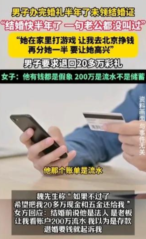 原来,在河南不少地方有先办婚礼后领证的习俗,魏先生便是如此。如今,女方拒绝领证,魏先生觉得日子过不下去,希望女方退还20多万彩礼及五金。